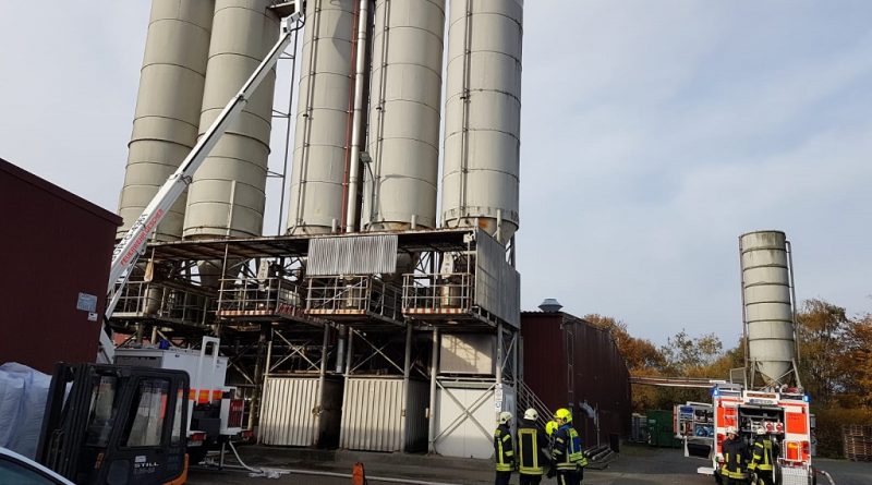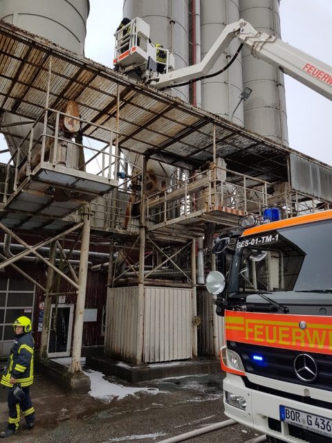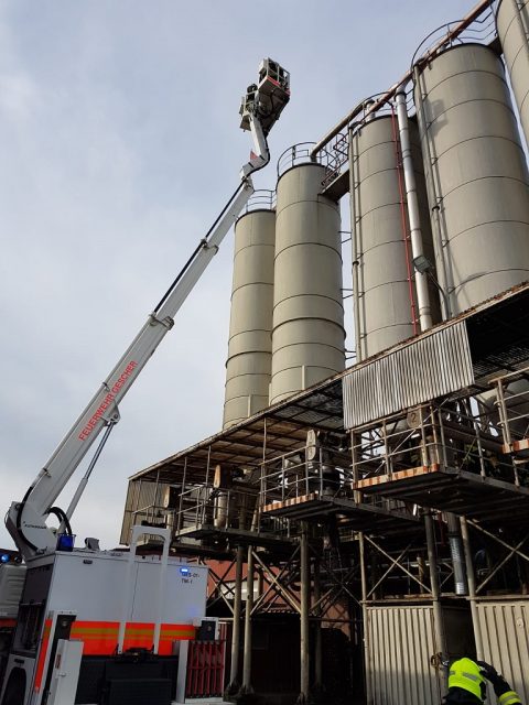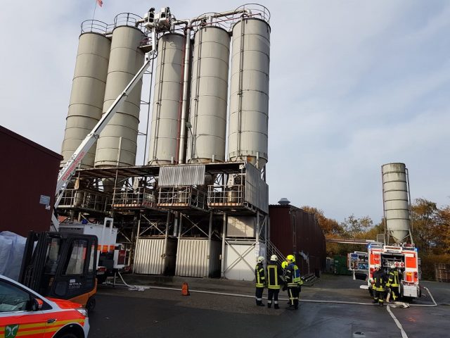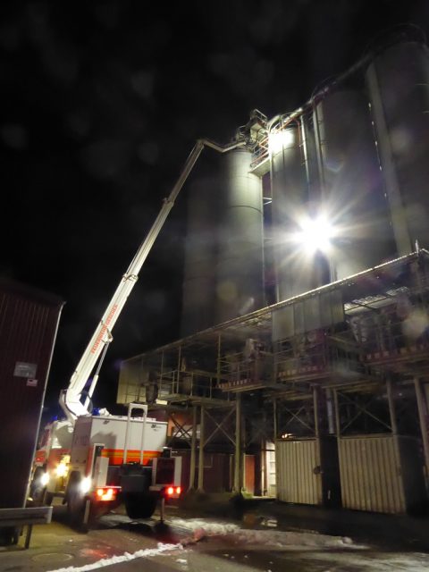 Update: Das Silo wurde auch über 18 Uhr hinaus weiter mit Wasser geflutet. Gegen 20 Uhr entschied man sich dann abschließend noch einmal das Silo von Oben mit Schwerschaum zu füllen. Dazu wurde das Schaummittel mit dem Teleskopmast auf das Silodach transportiert und dort direkt zugemischt und damit das Silo gefüllt. Gegen 21:15 Uhr wurde der Einsatz dann beendet. Eine Brandwache zur weiteren Kontrolle der Temperaturentwicklung im Silo wurde über Nacht durch Mitarbeiter des Betriebes gestellt.