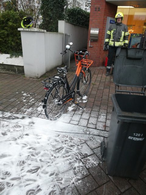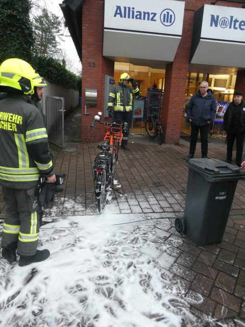 Gegen 9:40 Uhr wurde die Feuerwehr Gescher zu einem brennenden Fahrradakku auf die Hauptstraße gerufen. Vor Ort wurde der Brand bereits mit Hilfe eines Schaumlöschers gelöscht. Die Feuerwehr kontrollierte den Fahrradakku mit einer Wärmebildkamera. Anschließend wurde dieser in einer mit Wasser gefüllten Mülltonne zur weiteren Kühlung gelagert. Die Feuerwehr reinigte anschließend die Fahrbahn vom Schaummittel.