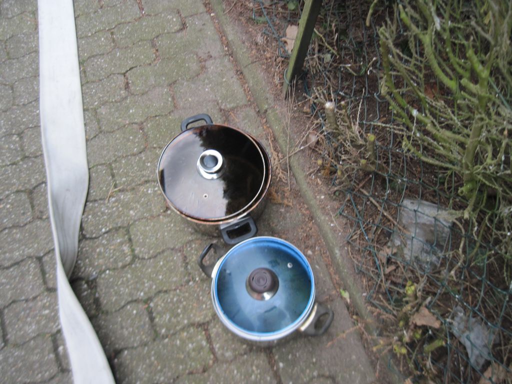 Deshalb wurde die Etagentür durch den Angriffstrupp unter Atemschutz geöffnet. Es stellte sich dann heraus, dass die Bewohner nicht da waren und auf dem Herd noch 2 Kochtöpfe standen. Die Töpfe wurden entfernt, die