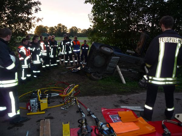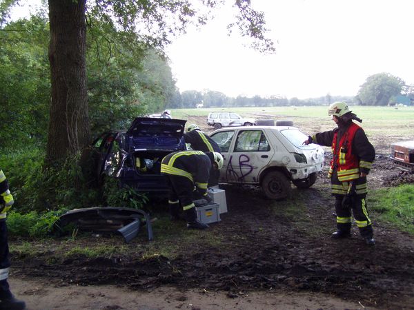 Das Stoppelfeldrennen in Stevede bietet der Feuerwehr Coesfeld jährlich die Gelegenheit die technische Hilfe intensiv zu üben, denn die Fahrzeuge des Rennens stehen im Nachhinein für Übungen zur Verfügung. So auch in diesem Jahr. Dazu wurde auch die Feuerwehr Gescher eingeladen. Die Organisatoren der Übung haben 3 Szenarien vorbereitet und jede Fahrzeugbesatzung konnte so eine eigene Lage beüben.