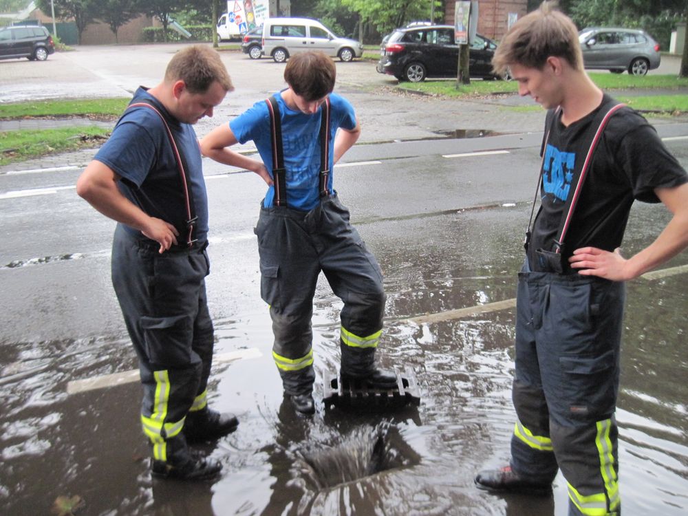 Alle Hände voll zu tun hatte die Feuerwehr aufgrund des starkten Regenfalls während des Gewitters am Samstag Abend. So musste die ersten Kameraden aus Gescher gegen 20 Uhr den Abwasserschacht auf der Konrad Adenauer Straße von Schmutz befreien, so dass das Wasser auf der Straße wieder ablaufen konnte.