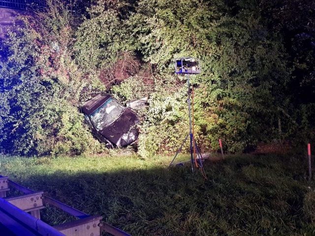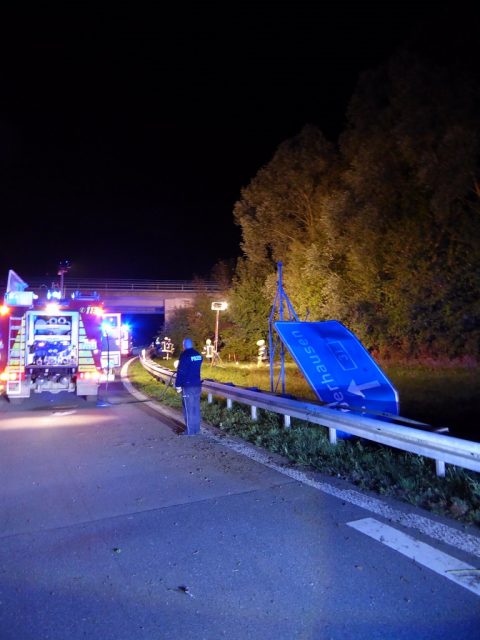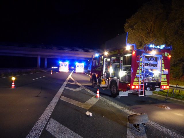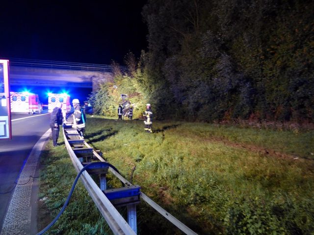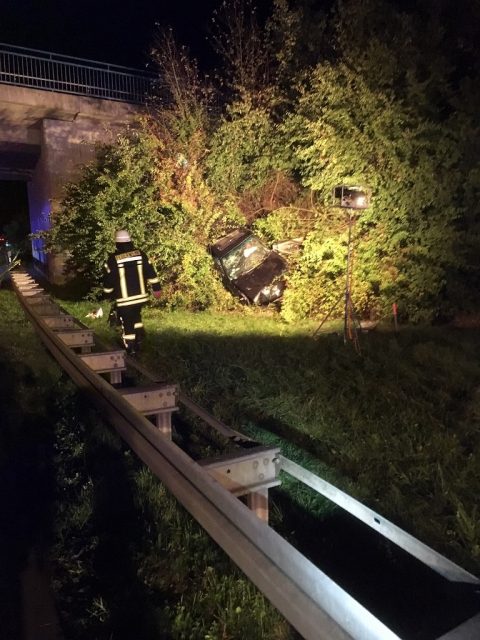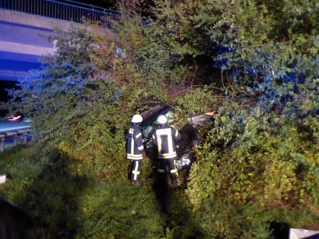 Ein PKW Fahrer aus Wuppertal hat vermutlich nach einem Reifenplatzer bei hohem Tempo die Kontrolle über sein Fahrzeug verloren und über die Lärmschutzböschung am Parkplatz gefahren. Auf der Höhe der Parkplatzausfahrt geriet das Fahrzeug dann auf die beginnende Leitplanke, wurde daraufhin hochkatapuliert gegen ein Verkehrsschild und blieb dann etwa 100 m weiter in der Brückenböschung liegen. Dabei wurden der Fahrer sowie der Beifahrer verletzt. Beide wurden durch Rettungswagen in Krankenhäuser gebracht.