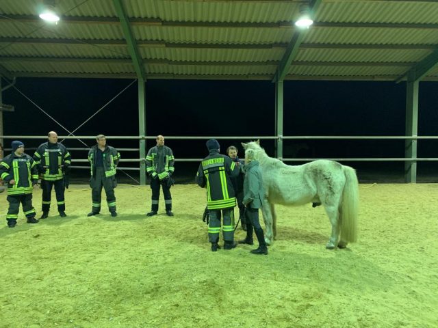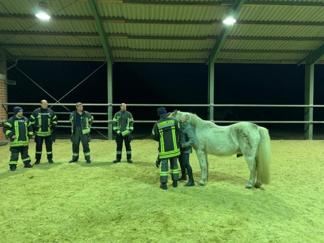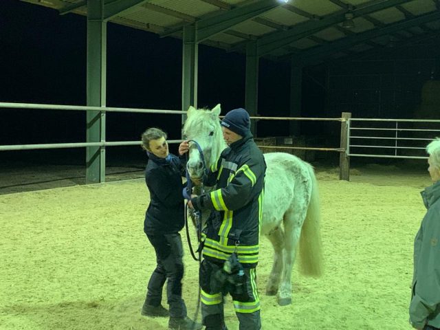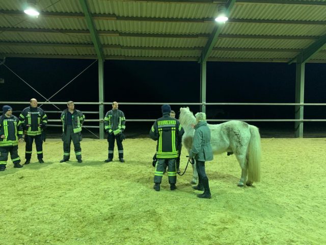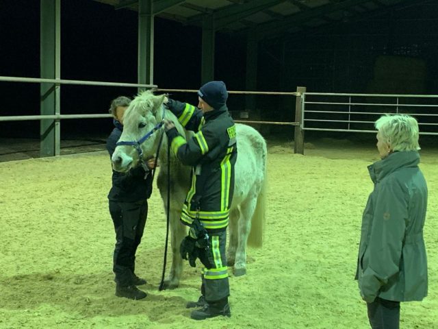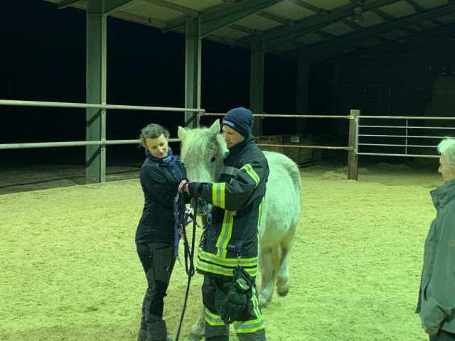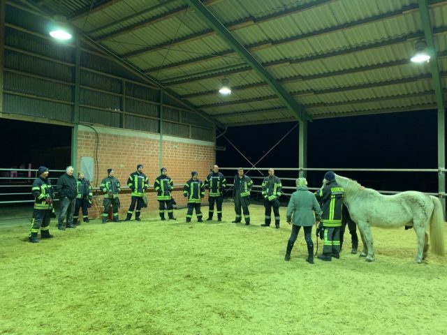 Am Donnerstagabend traf sich ein Teil der Feuerwehr Gescher zu einer Übung mit dem Thema Großtierrettung. Dazu ging es auf einen Hof eines Feuerwehrkollegen in Hochmoor. Dort wurde speziell auf das Thema Umgang mit Pferden eingegangen. So wurde in kleinen Übungen u.a. das Anlegen des Halfters und das Führen von Pferden beübt sowie das Öffnen von Pferdeboxen besprochen, um in einem Einsatzfall Tiere aus gefährdeten Bereichen führen zu können. Diese Übung hatten die Kameraden des Löschzuges Hochmoor sowie die anderen Kameraden des Löschzuges bereits beim vorherigen Übungsdienst durchgeführt. Die jeweils anderen Kamerden befassten sich mit dem Thema „Brandbekämpfung zur Menschenrettung“.
