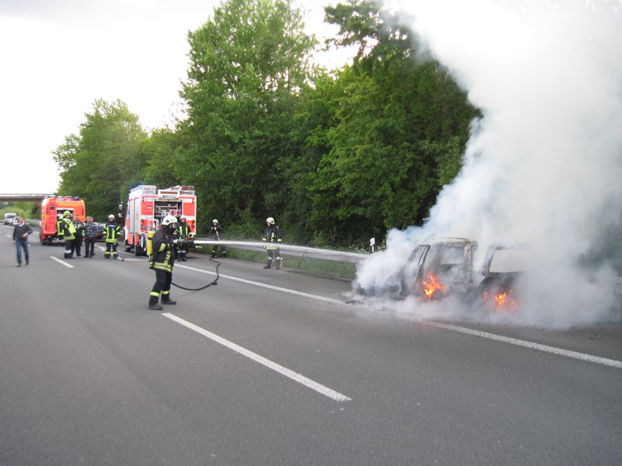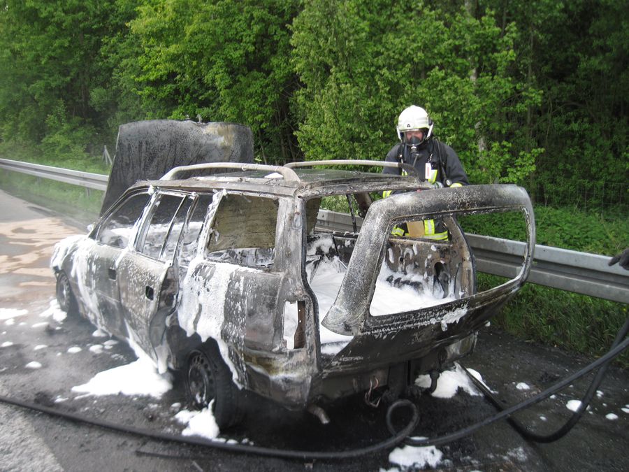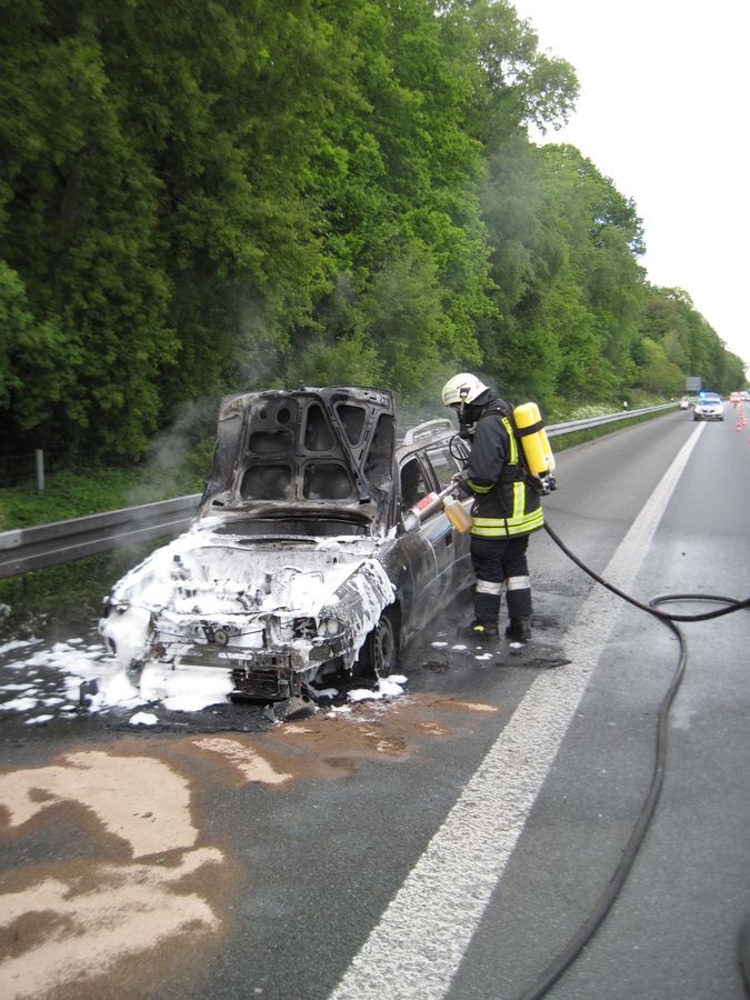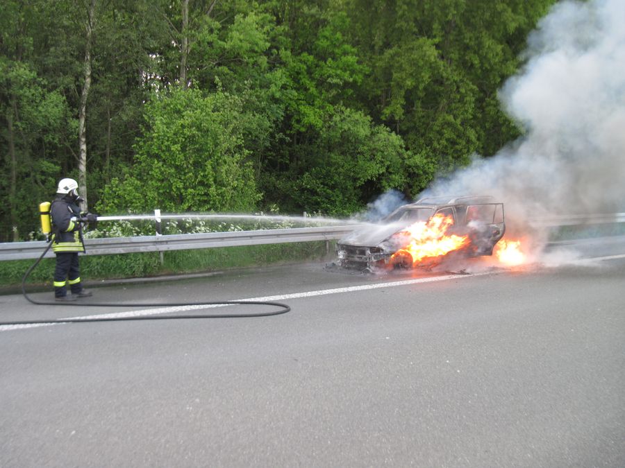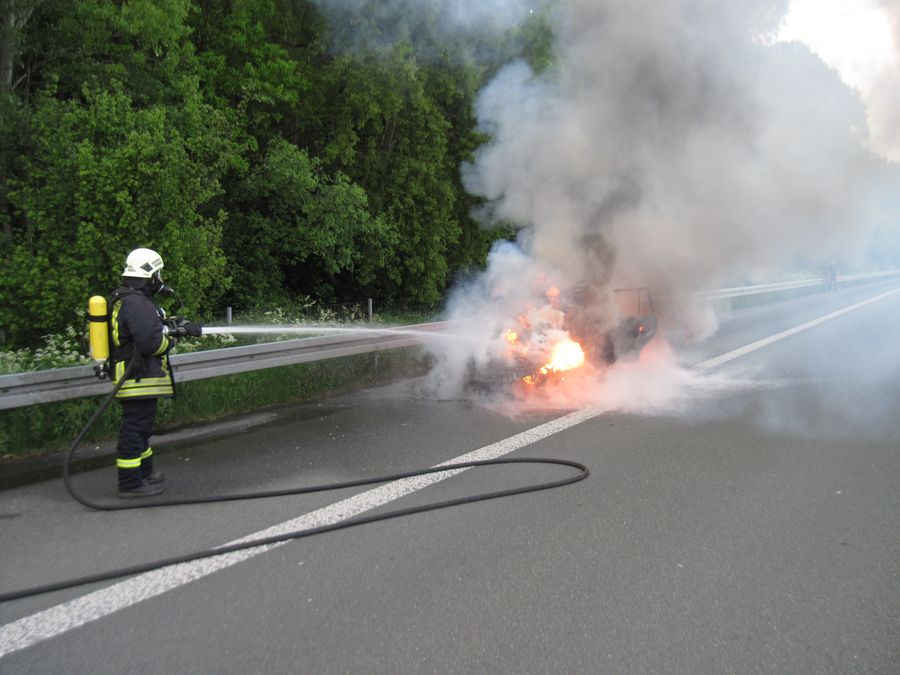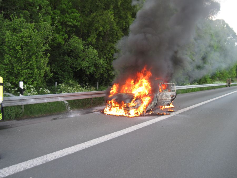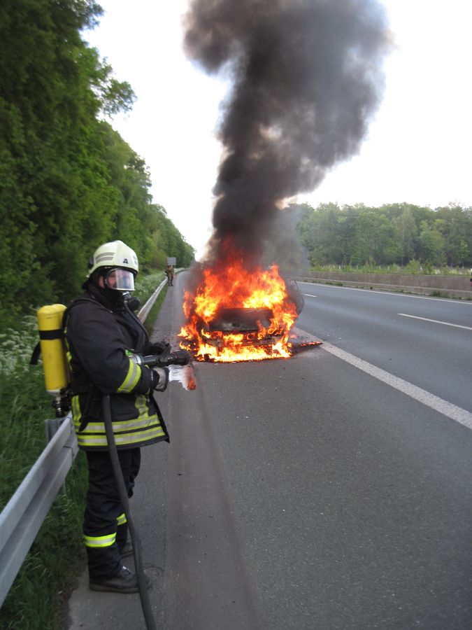 Zu einem PKW-Brand musste die Feuerwehr Gescher am frühen Mittwochabend zur A31 Fahrtrichtung Bottrop ausrücken. Schon auf der Anfahrt war eine große Qualmwolke zu sehen. So bestätigte sich beim Eintreffen auch, dass der Wagen bereits in Vollbrand stand. Die Feuerwehr löschte das Fahrzeug zunächst mit Wasser ab, um dann anschließend mit Schaum ein erneutes Aufflammen zu verhindern. Ausgelaufener Kraftstoff wurde mit Bindemittel aufgenommen. Die Fahrbahn wurde während der Löschmaßnahmen ganz gesperrt und dann bis zur Bergung des Fahrzeuges einspurig abgesperrt.