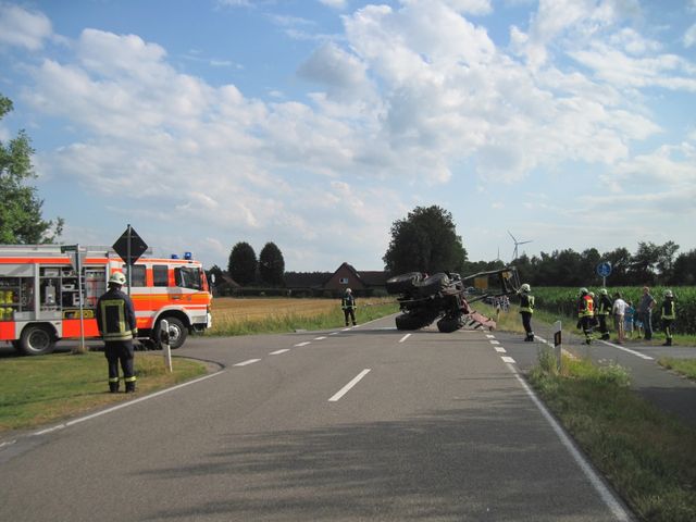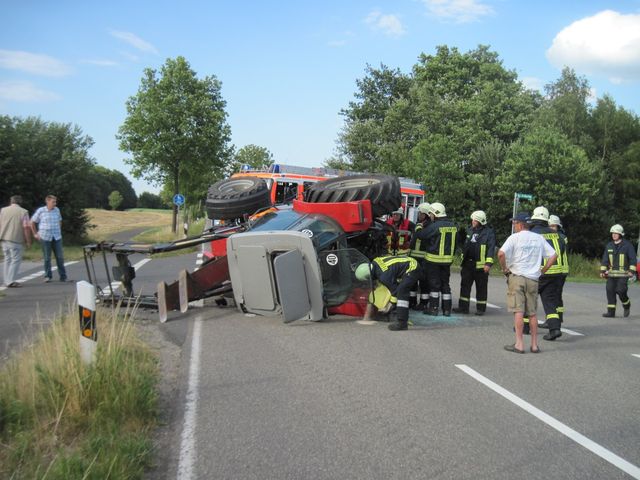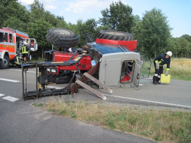 In Tungerloh Capellen auf der Verbindungstrasse B525 Richtung Autobahn Kapelle ist ein Traktor in den Seitenstreifen gekommen und beim Gegenlenken samt dem Anhänger umgestürtzt und lag dann komplett quer zur Fahrbahn. Der Fahrer wurde bei diesem Unfall nur leicht verletzt.