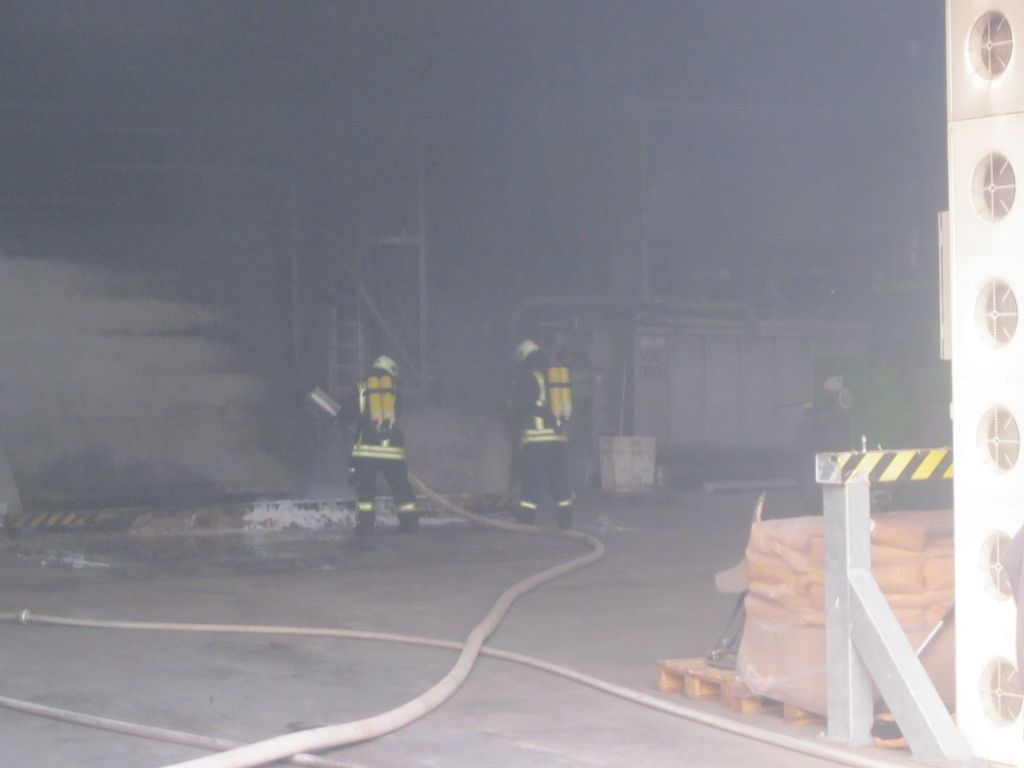 Dann wurden die Förderschnecken unterhalb der Bunker geöffnet und ebenfalls mit Schaum gelöscht. Die Brandstelle wurde mit der Wärmebildkamera kontrolliert. Insgesamt kamen 6 Trupps unter Atemschutz zum Einsatz und es wurde ca. 480 l Schaummittel benötigt. Der Einsatz war gegen 10 Uhr beendet. Am Gerätehaus mussten die Fahrzeuge dann noch wieder einsatzbereit gemacht werden.