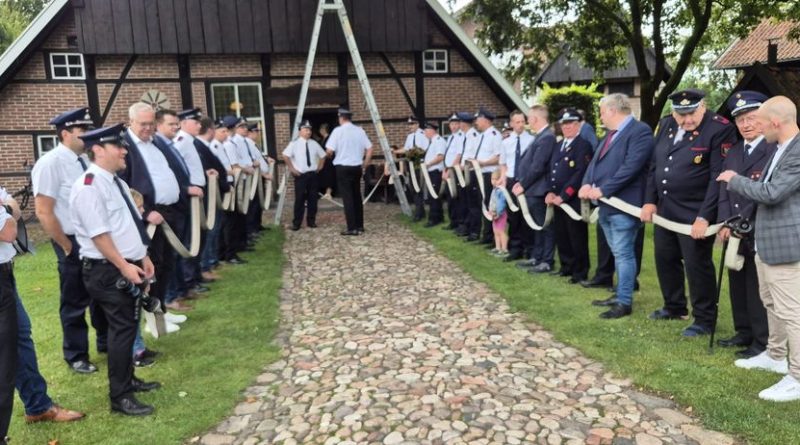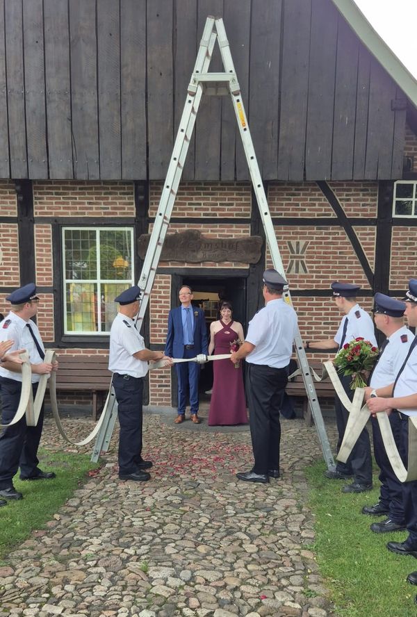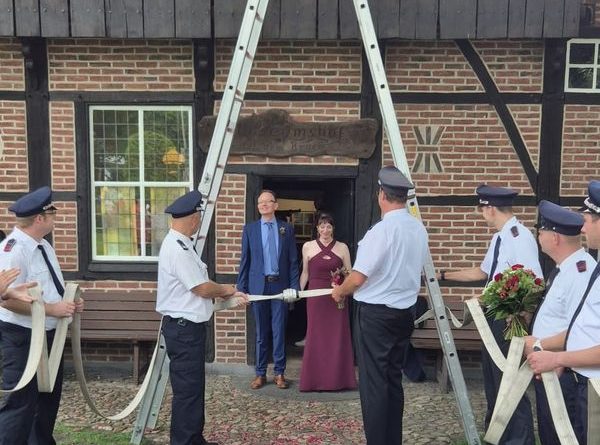 Laut schallte der Feuerwehrmannsgruß am Freitag über den Museumshof. Anlässlich ihrer Silberhochzeit bildeten die Mitglieder der Feuerwehr Gescher das Ehrenspalier für das Silberpaar Silke und Alexander Weever. Erst nachdem das Paar ihren immer noch vorhandenen Teamgeist bewiesen hatte, indem sie gemeinsam eine Schlauchkupplung lösten, konnten sie das Spalier durchschreiten.  Zu den ersten Gratulanten zählten Löschzugführer Stefan Theßeling und Ralf Blommel.