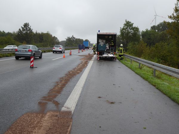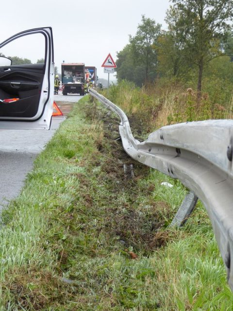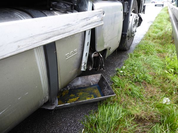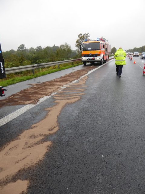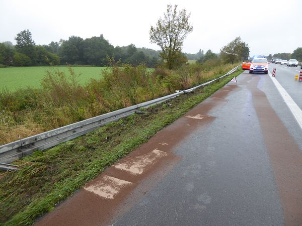 Ein LKW Fahrer hatte aus ungeklärter Ursache die Kontrolle über sein Fahrzeug verloren und war auf die Bankette und gegen die Leitplanke geraten. Der Fahrer blieb dabei unverletzt, sodass der RTW wieder abrücken konnte. Durch die Leitplanke und die besonnene Reaktion des LKW-Fahrers war schlimmeres verhindert worden. Lediglich der Tank bekam einen Riss und deshalb ergoss sich auf ca. 500m Länge Diesel auf der rechten Spur sowie dem Standstreifen.