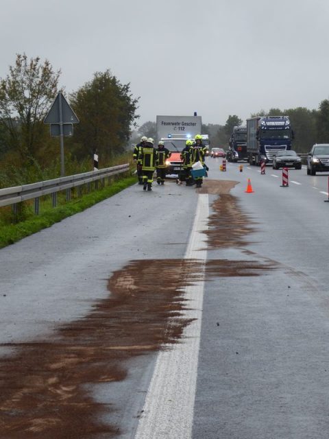 Mit der Meldung „Unfall mit LKW, es laufen massiv Betriebsmittel aus“ wurde gegen 14.53 Uhr der Löschzug Gescher am Montag auf die A31 in Fahrtrichtung Oberhausen gerufen. Da im ersten Notruf von einem Unfall die Rede war wurde auch der Rettungswagen (RTW) aus Gescher zur Einsatzstelle alarmiert.