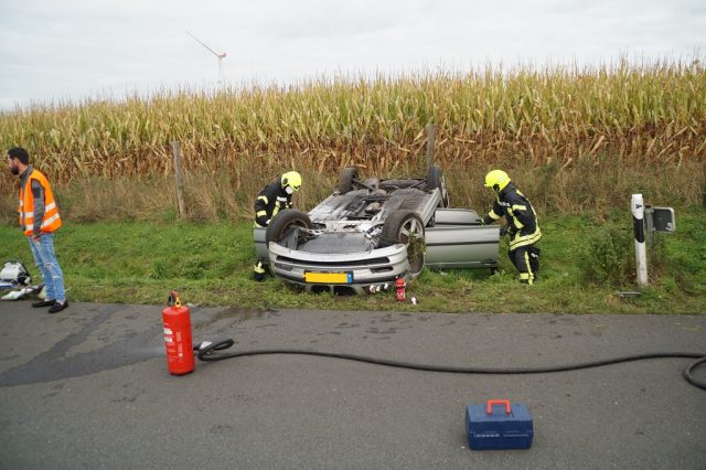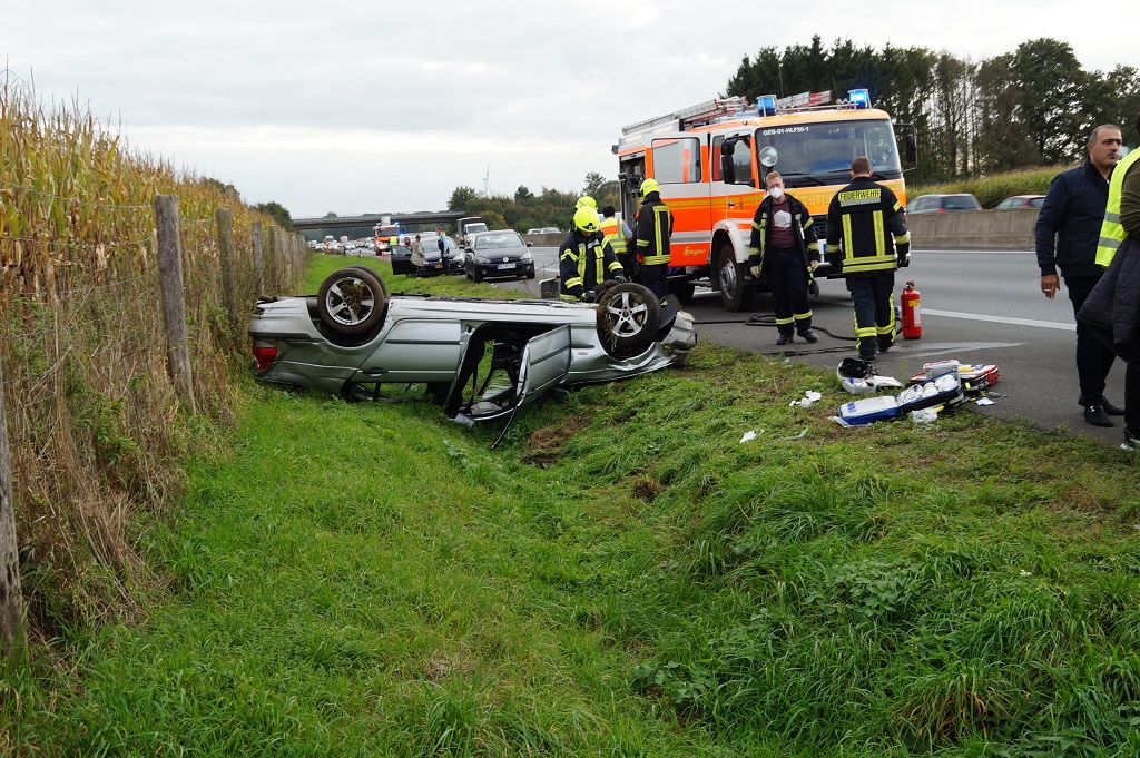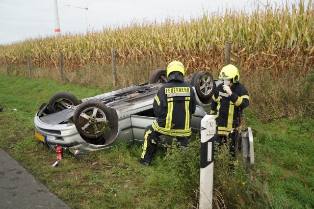 Gegen 15:15 Uhr wurde die Feuerwehr Gescher zu einem Verkehrsunfall auf die A31 in Fahrtrichtung Emden gerufen. Dort war es zu einem Alleinunfall eines niederländischen PKWs gekommen. Die Fahrerin kam dabei nach rechts von der Fahrbahn ab und überschlug sich mehrfach im Graben bevor es auf dem Dach liegen blieb. Bei Eintreffen des Rettungsdienstes und der Feuerwehr waren alle drei Insassen bereits aus dem Fahrzeug befreit. Während sich der Rettungsdienst zunächst um die schwerer verletzte Fahrerin kümmerte, versorgte die Feuerwehr bis zum Eintreffen weiterer Rettungswagen die zwei anderen Insassen. Alle drei Insassen kamen zur weiteren Behandlung ins Krankenhaus. Weitere Personen aus anderen Fahrzeugen, die zusammen mit dem Unfallfahrzeug unterwegs waren mussten ebenfalls von der Feuerwehr betreut werden. Zusätzlich wurde die Einsatzstelle gegen den weiteren Verkehr abgesichert. Da das Fahrzeug einen Gastank hatte, wurde dieses mit der Wärmebildkamera auf etwaige Undichtigkeiten kontrolliert. Daher verblioeb dei Feuerwehr auch bis zur Fahrzeugbergung an der Einsatzstelle.