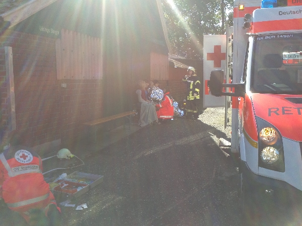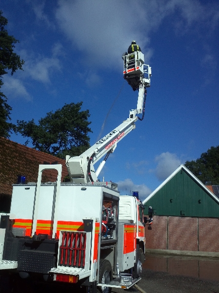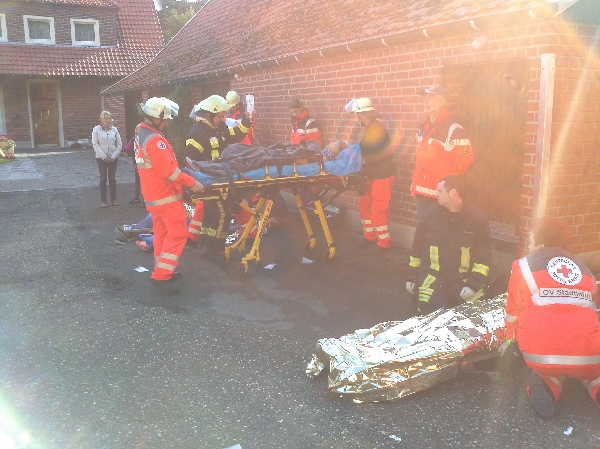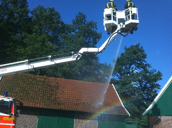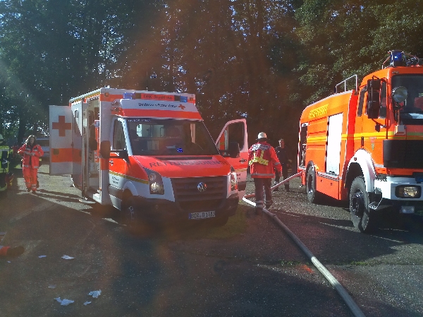 Mit einer Alarmübung hatten die Kameraden der Feuerwehr Gescher nicht gerechnet als sie am Sonntag morgen um 8:00 Uhr zur nachbarschaftlichen Löschhilfe nach Stadtlohn gerufen wurden. Dort sollte in Hundewick eine Scheune brennen und von der Feuerwehr Gescher wurde der Tankwagen und der Teleskopmast benötigt. Erst an der Einsatzstelle zeigte es sich, dass es eine Übung war. Nach einer Party ist am frühem Sonntagmorgen eine Scheune in Brand geraten. Es wurden mehrere Jugendliche vermisst und das Feuer bedrohte weitere Gebäude.