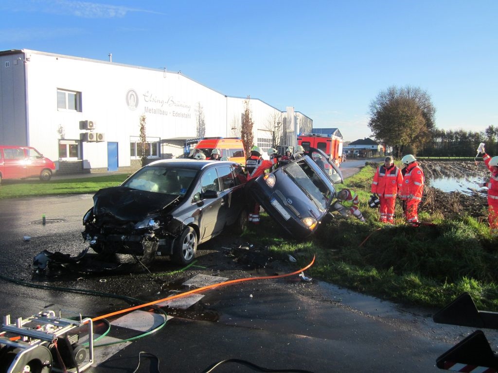 Zu einem Verkehrsunfall ist es auf der Kreuzung Venneweg / Schildarpstrasse gekommen. Ein vom Venneweg stadtauswärtsfahrender Verkehrsteilnehmer hat die Vorfahrt von einem rechts kommenden PKW missachtet. Dessen Fahrer konnte nicht mehr rechtzeitig abbremsen und fuhr dem Anderen in die Beifahrerseite und schob ihn in den gegenüberliegenden Graben. Dort kam der PKW auf der Seite liegend zum Stehen. In diesem Fahrzeug war der Fahrer eingeklemmt worden und musste von der Feuerwehr patientengerecht befreit werden. Die Feuerwehr stabilisierte zunächst das auf der Seite liegende Fahrzeug und entfernte dann das Dach des Fahrzeuges mit Schere und Spreizer. Anschließend konnte der Patient aus dem Fahrzeug gerettet und dem Rettungsdienst übergeben werden. Beide Fahrer kamen verletzt mit dem Rettungswagen ins Krankenhaus. Zusätzlich rettete die Feuerwehr einen verletzten Hund aus dem Fußraum des deformierten Fahrzeuges und übergaben diesen zur weiteren Versorgung an den hinzu gerufenen Tierarzt. Die Kreuzung sowie die Zufahrtsstraßen wurden während den Rettungsarbeiten gesperrt.