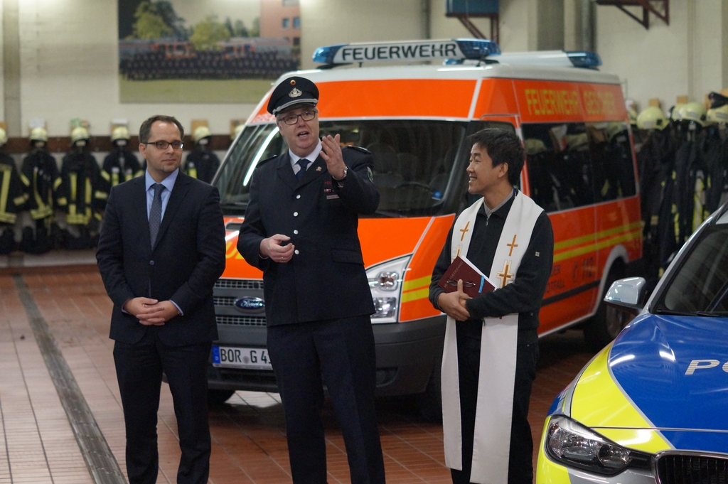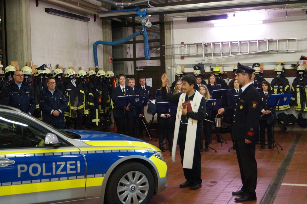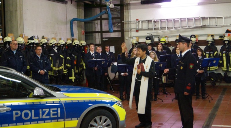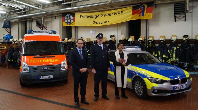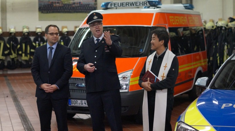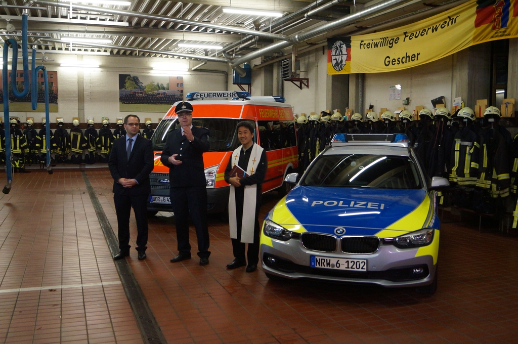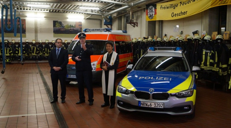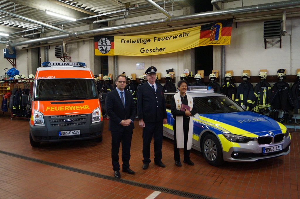 Nach der Schlüsselübergabe wurde das Fahrzeug durch den Pfarrer Phan eingesegnet. Er freute sich, dass dies eine Tradition bei Einsatzfahrzeugen sei. Da auch die Polizeikräfte aus Gescher gerade ein neues Einsatzfahrzeug bekommen haben, wurde sogleich auch dieses Fahrzeug gesegnet.