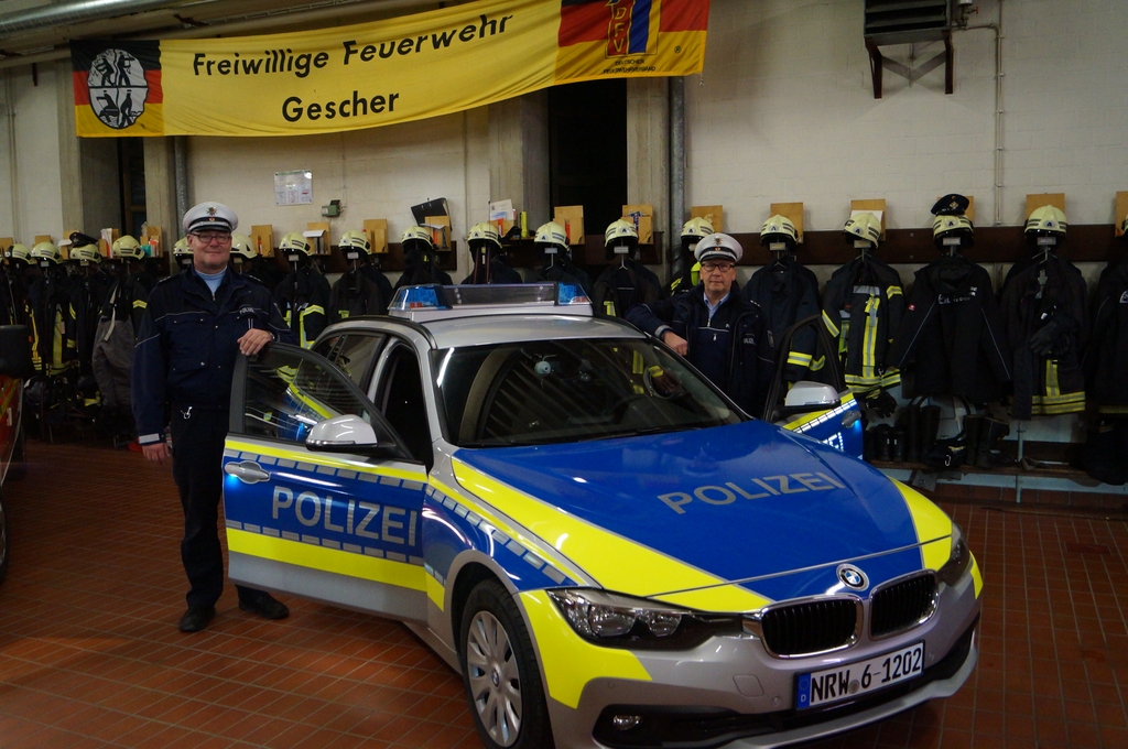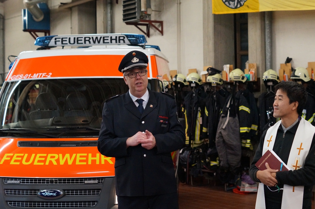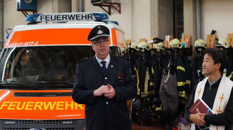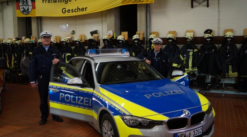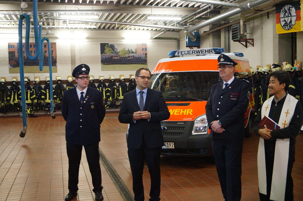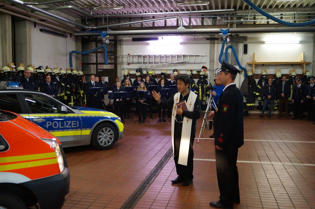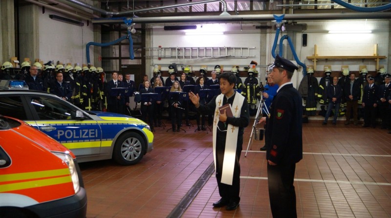 Nach der Schlüsselübergabe wurde das Fahrzeug durch den Pfarrer Phan eingesegnet. Er freute sich, dass dies eine Tradition bei Einsatzfahrzeugen sei. Da auch die Polizeikräfte aus Gescher gerade ein neues Einsatzfahrzeug bekommen haben, wurde sogleich auch dieses Fahrzeug gesegnet.