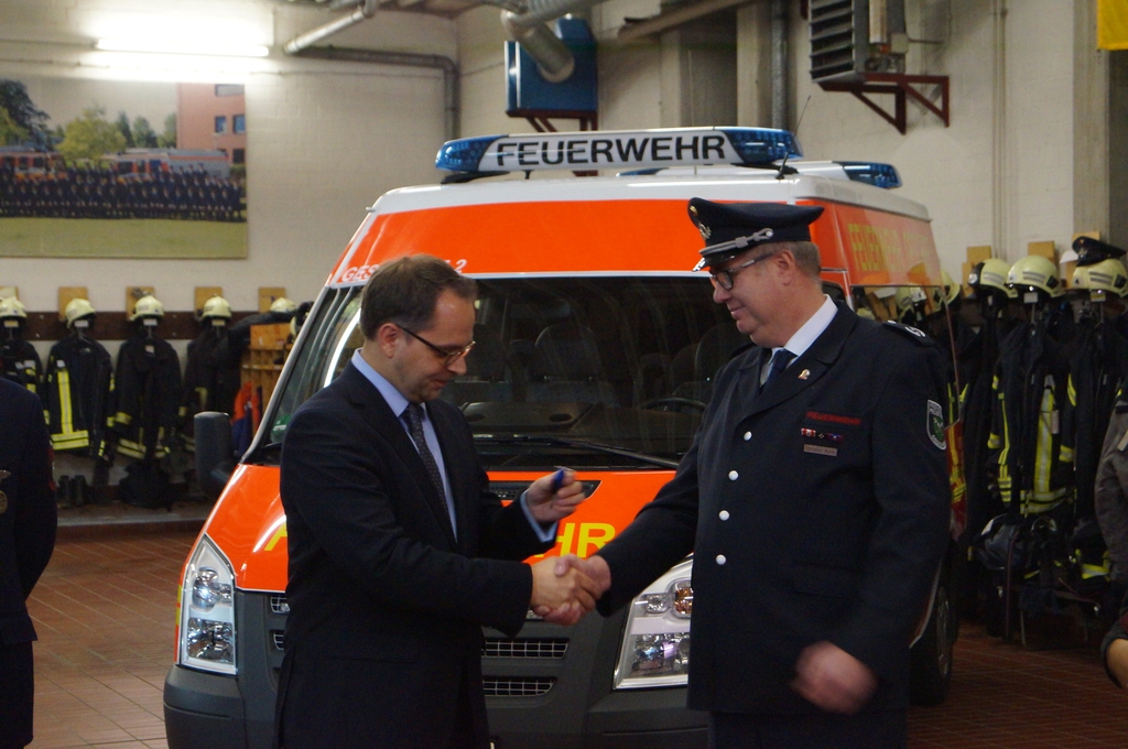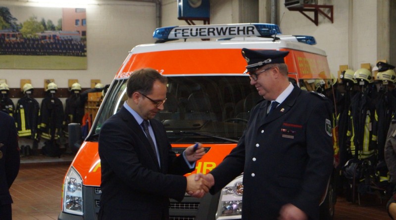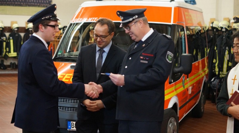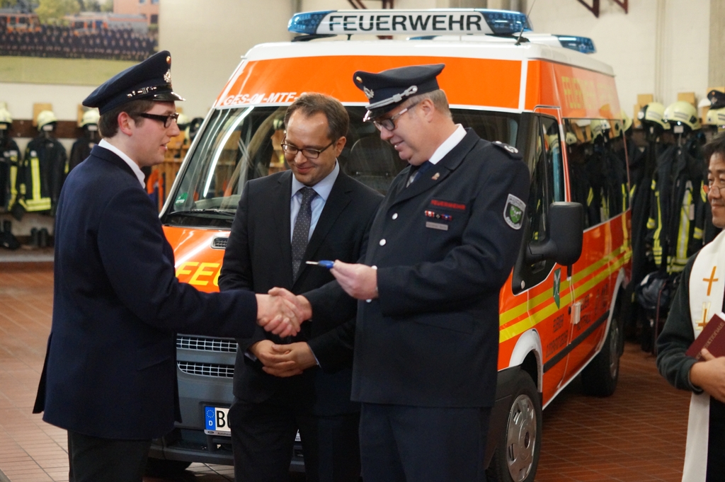 Anschließend übergab er das Wort an den Bürgermeister Thomas Kerkhoff der sich freute, das Fahrzeug übergeben zu können. Gleichzeitig hoffte er, dass das Fahrzeug möglichst nur für freudige Dinge eingesetzt werden muss und wünschte den zukünftigen Fahrern allseits gute Fahrt. Dann übergab er die Fahrzeugschlüssel an den STBI Christian Nolte, der wiederum die Schlüssel an den Gerätewart Kevin Osterkamp weiterreichte.