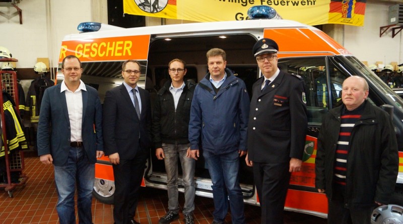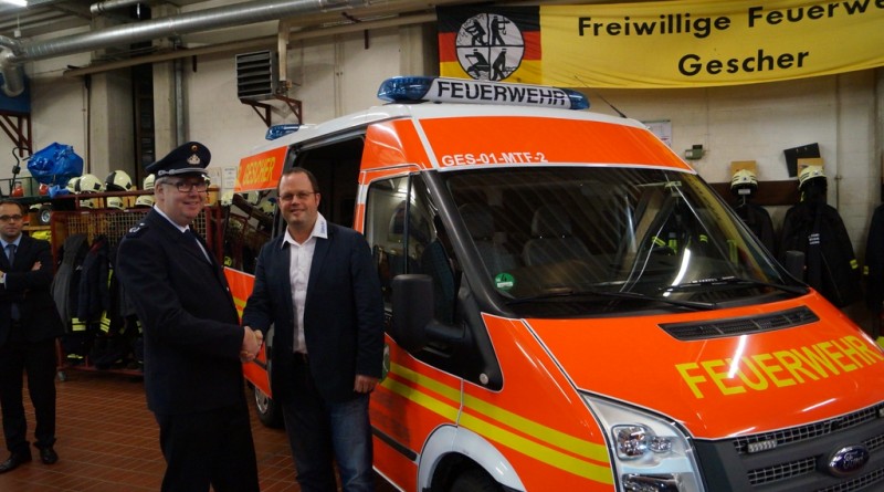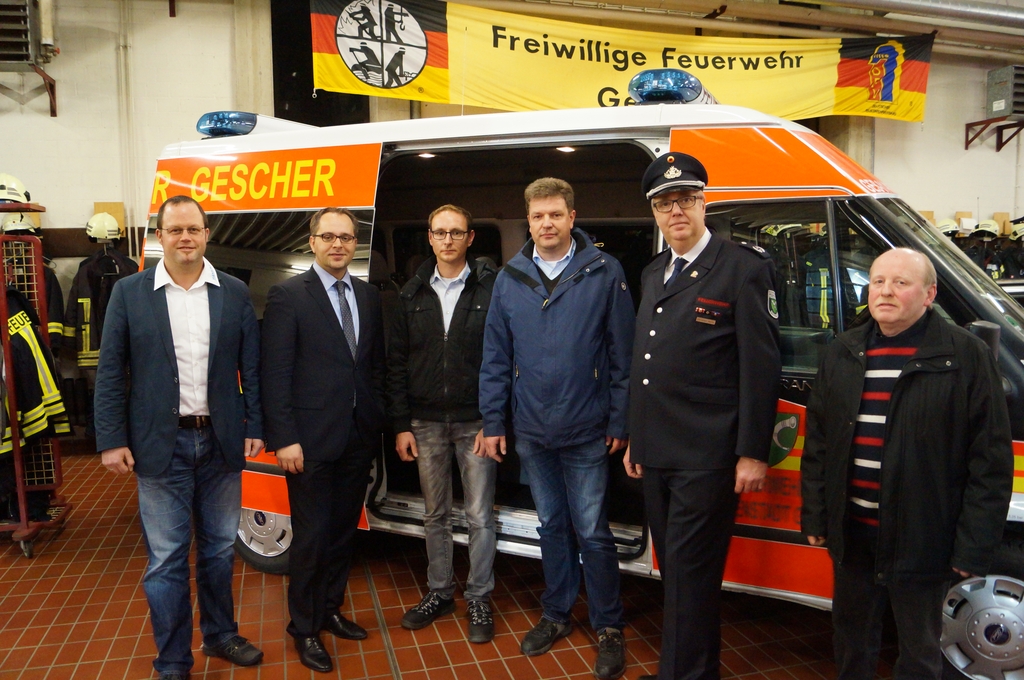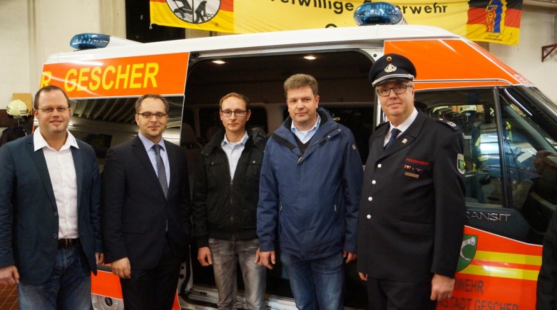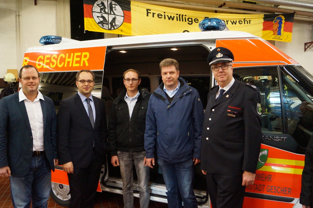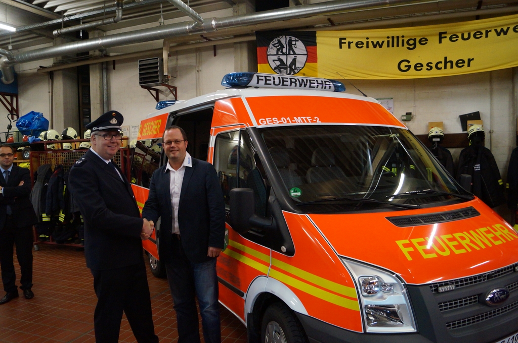 Bei dem neuen Feuerwehrfahrzeug handelt es sich um einen sogenannten Mannschaftstransportfahrzeug (MTF) für den Löschzug Gescher. Mit Hilfe des Stadtetats wurde nach Ausschreibung ein gebrauchter Ford Transit mit Hochdach bei der Firma Bönning Heisterkamp erworden. Die Feuerwehreinbauten wie Funkgerät, Blaulichtbalken (durch die Firma Hänsch) und Ladegeräte für Handlampen und digitale Handfunkgeräte wurden durch weitere Unternehmen im Umkreis durchgeführt. Abschließend wurde das weiße Fahrzeug mit roter und gelber Folie durch eine Fachfirma in Hochmoor beklebt, so dass es auch als Feuerwehrfahrzeug zu erkennen ist. Bei der Türbeschriftung wurde neben dem Wappen der Schriftzug „Feuerwehr Glockenstadt Gescher“ gewählt.