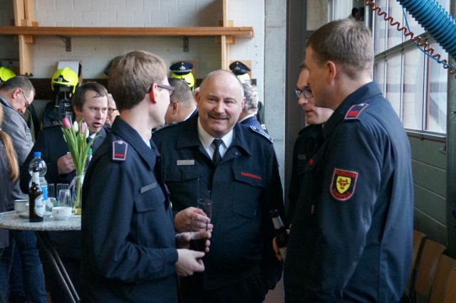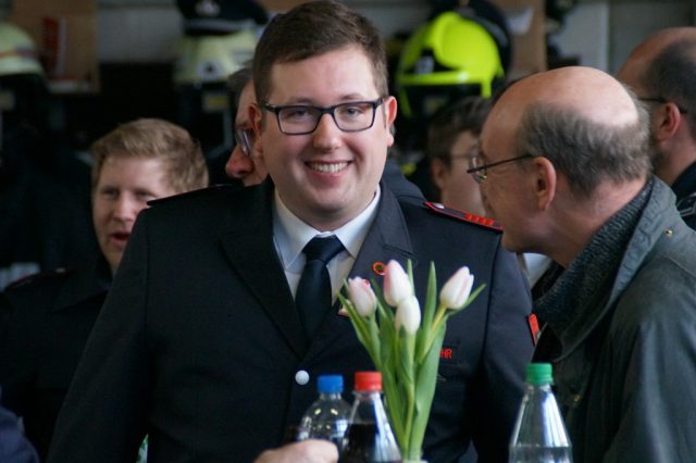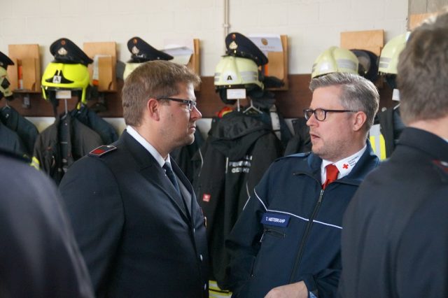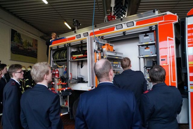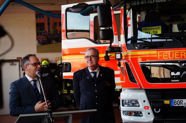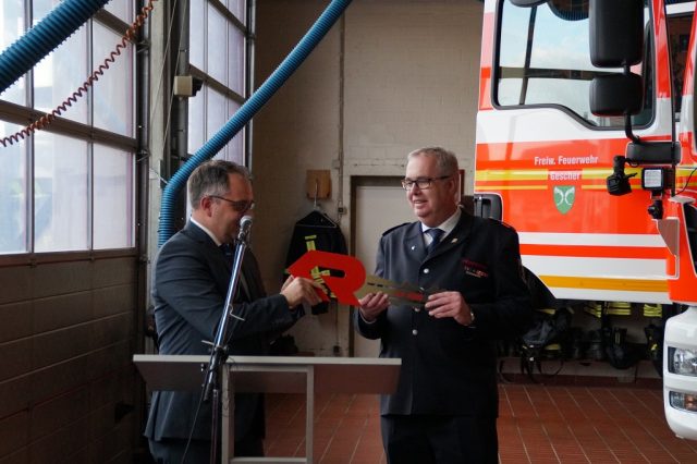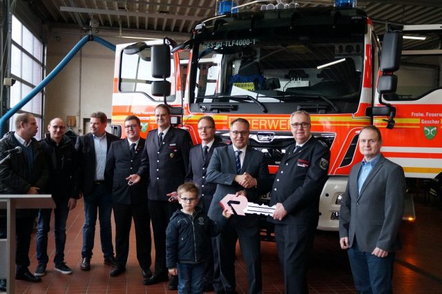 Der Bürgermeister Thomas Kerkhoff begrüßte ebenso alle Anwesenden. Er freute sich gleich 3 Fahrzeuge an die Feuerwehr Gescher übergeben zu können und so ein Zugewinn der Sicherheit für die Bürger Geschers zu schaffen. Dies waren im Einzelnen der Kommandowagen (KdoW) , ein Mannschaftstransportfahrzeug (MTF) vorrangig für die Kinderfeuerwehr sowie ein Tanklöschfahrzeug (TLF 4000) als Ersatz für das 25 Jahre im Dienst befindliche Vorgängerfahrzeug. Er übergab die Schlüssel symbolisch an den Stadtbrandinspektor Christian Nolte, der die Schlüssel dann an die Löschzugführer Alexander Weever und Stefan Theßeling sowie dem Gerätewart Kevin Osterkamp weiter reichen konnte.