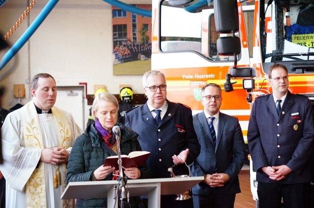 Anschließend wurden die Fahrzeuge und die Mannschaft in einer ökunemischen Feier durch Pastor Wenning und der Prädikantin Frau Ebbert Brüggemann gesegnet.