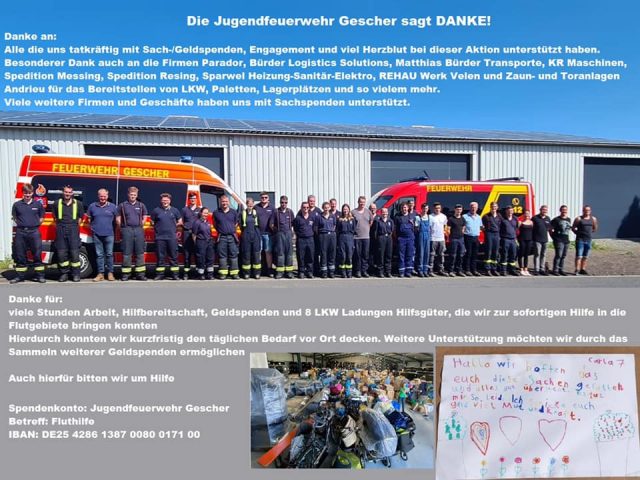 Zurzeit sammelt die Jugendfeuerwehr naoch immer Geldspenden. Das Spendenkonto lautet: