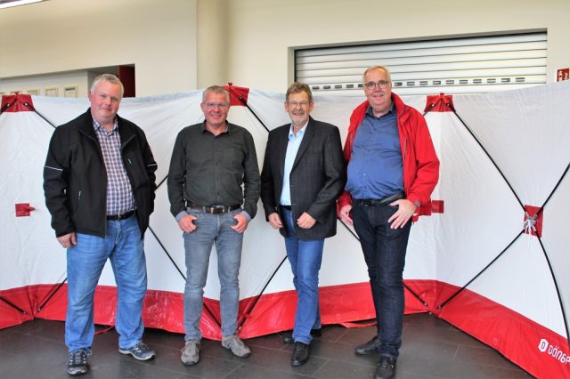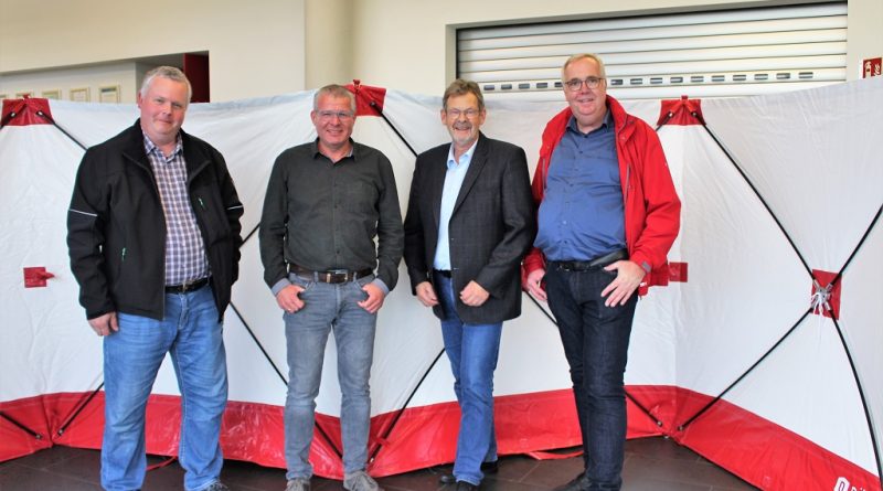Die Feuerwehr Gescher hat jetzt 2 mobile Sichtschutzwände als Spende von der Entsorgungsgesellschaft Westmünsterland mbH erhalten. Diese Wände können immer dann eingesetzt werden, wenn durch Gaffer die Persönlichkeitsrechte von Patienten während der Rettung gefährdet sind. Die mobilen Sichtschutzwände werden zukünftig auf den Einsatzfahrzeugen mitgeführt und können dann bei Bedarf schnell aufgestellt werden und binden dann kein Einsatzpersonal, dass bisher oft mit Decken die Patienten abgeschirmt haben. Bei der Spendenübergabe bedankte sich der Leiter der Feuerwehr Christian Nolte sowie der Stellvertreter Dirk Lütkenhaus bei dem Geschäftsführer Herrn Kleyboldt sowie Andreas Rudde bedankt.