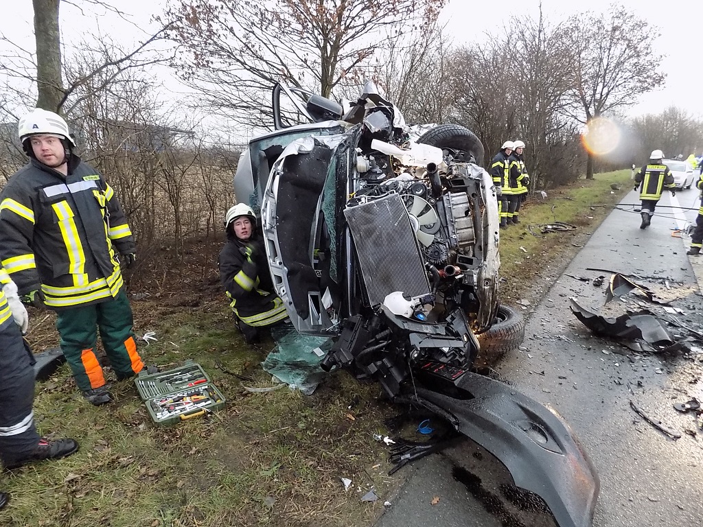 Gegen 15:45 Uhr wurde die Feuerwehr Gescher zu einem Verkehrsunfall auf der B 525 zwischen der Abfahrt Gescher und dem Kreisverkehr zur L 608 mit mehreren verletzten Personen gerufen worden. Dort wurde ein Kleintransporter der in Richtung Südlohn unterwegs war von einem PKW überholt. Aufgrund dieses riskanten Überholvorganges musste ein entgegenkommender PKW stark abbremsen. Dabei geriet er in den Gegenverkehr und stieß frontal mit dem Kleintransporter zusammen. Dabei wurde der Fahrer des PKWs massiv in seinem Fahrzeug eingeklemmt. Der Kleintransporter kippte auf die Seite und blieb dort liegen. Der Fahrer dieses Fahrzeuges verletzte sich ebenfalls, konnte das Fahrzeug aber selber verlassen.