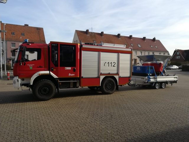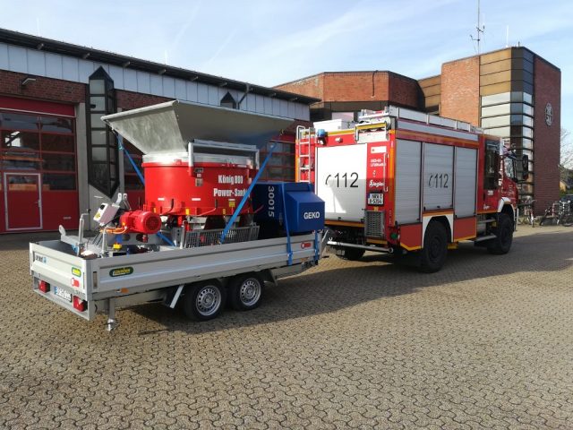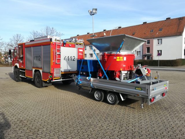 Die Kreiskomponente Sandsackfüllmaschine ist nun einsatzbereit auf einem Transportanhänger verlastet. Die im vergangenen Jahr vom Kreis Borken beschaffte Sandsackfüllmaschine mit einem dazugehörigen Stromaggregat und einem Zapfwellenantrieb wurde in dieser Woche auf einen ebenfalls vom Kreis beschafften Transportanhänger verlastet. Die Gerätschaften sind somit jetzt kurzfristig nach Anforderung im Kreisgebiet oder auch darüber hinaus einsetzbar. Die Feuerwehr Gescher übernimmt zukünftig den Transport mit dem LF 20 KaTs zur Einsatzstelle und die Einweisung des Bedienpersonals vor Ort. Die Feuerwehr Bocholt besitzt eine baugleiche Sandsackfüllmaschine. Somit stehen im Kreisgebiet für den Notfall zwei Füllmaschinen bereit. Pro Maschine können laut Herstellerangaben über 4000 Sandsäcke pro Stunde gefüllt werden.