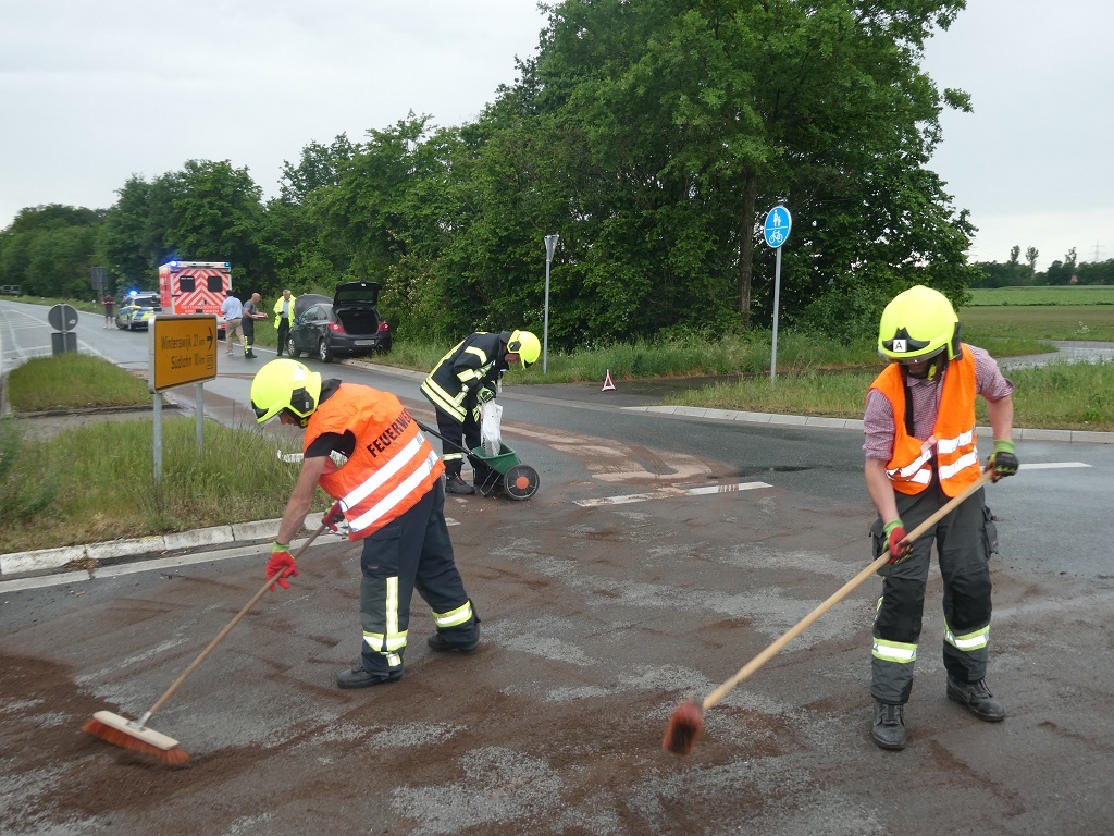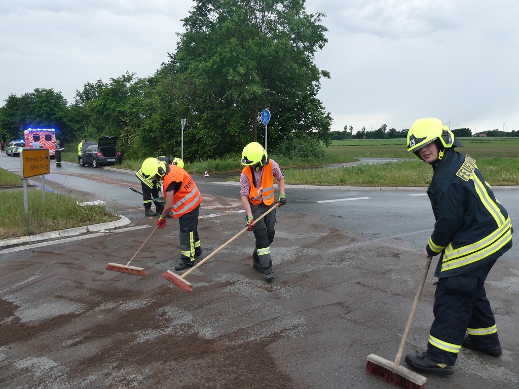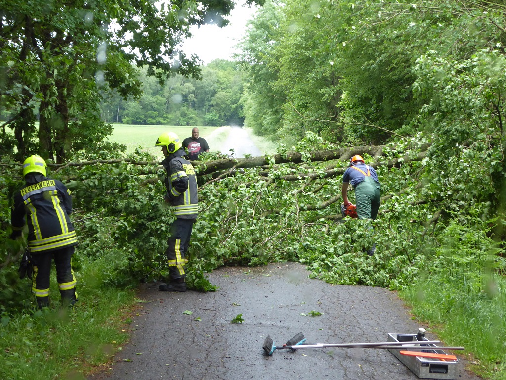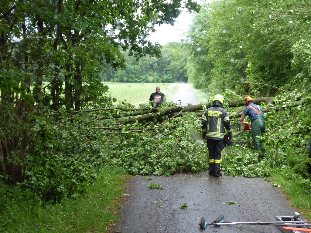 Das Unwetter hatte zunächst mehrere Äste auf der Konrad-Adenauer Straße auf die Straße geweht. Die Feuerwehr konnte diese von Hand von der Straße räumen. Im Anschluß wurde die Feuerwehr dann zu 2 umgekippten Bäumen in Tungerloh-Pröbsting gerufen. Diese mussten mit der Kettensäge beseitigt werden. Zudem sollte durch den Löschzug Hochmoor ein weiterer Baum auf der Rekener Straße beseitigt werden. Es konnte jedoch innerhalb des Stadtgebietes kein umgestürzter Baum ausgemacht werden, so dass man nicht mehr tätig werden musste. Fast zeitgleich wurde die Feuerwehr Gescher zum Kreisverkehr B525 gerufen. Dort ist ein PKW über die Mittelinsel gefahren und beschädigte sich dabei dei Ölwanne. Die Feuerwehr sicherte den hinzugerufenen Rettungswagen ab und sperrte den Kreisverkehr ab, um das ausgelaufene Öl mit Bindemittel aufzunehmen. Anschließend konnte die Einsatzstelle an die Polizei übergeben werden.