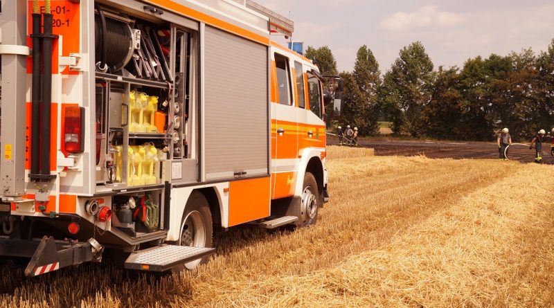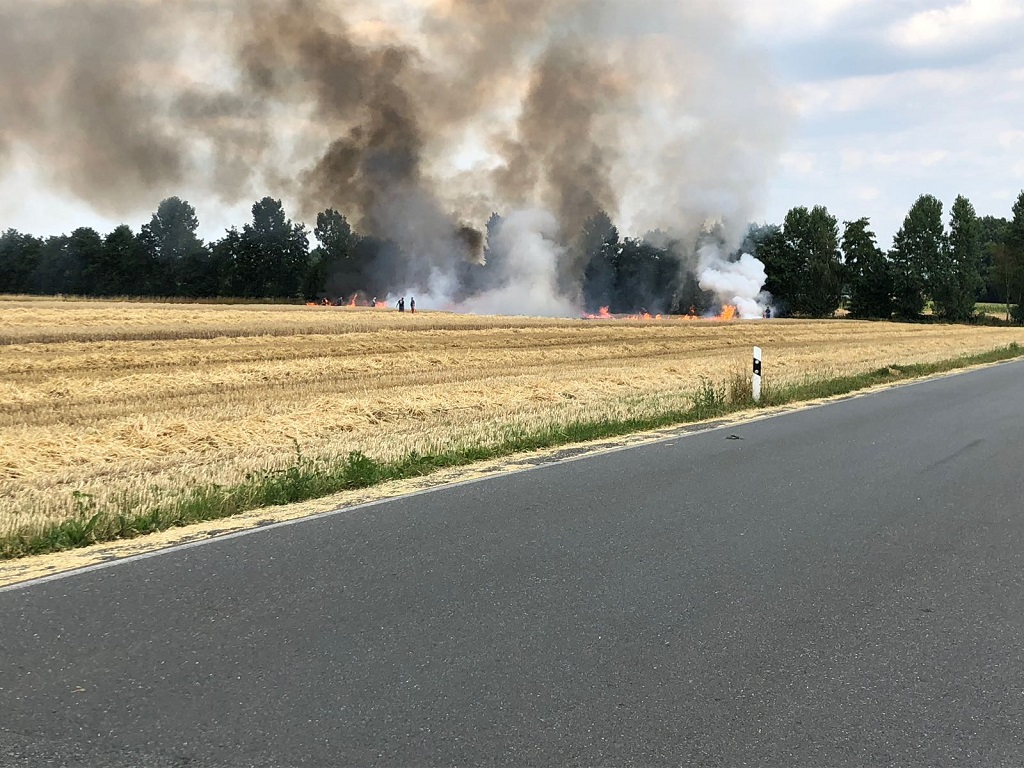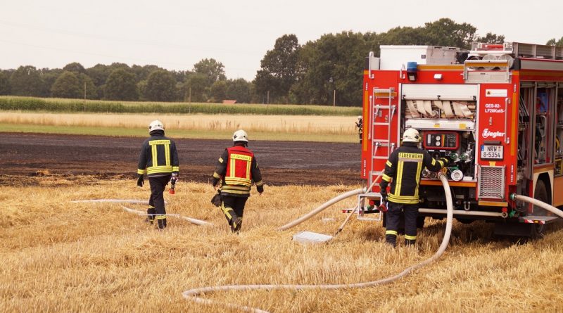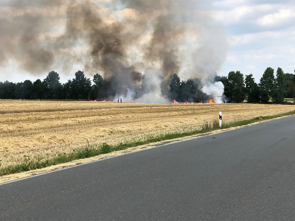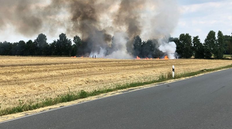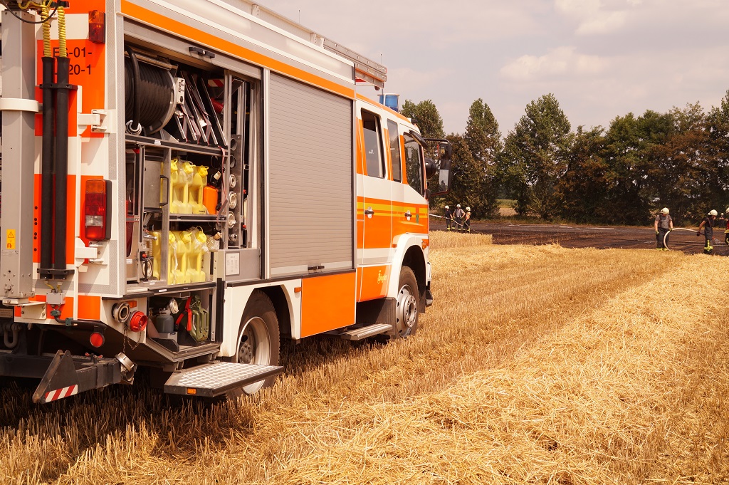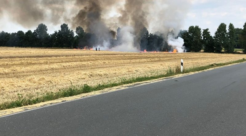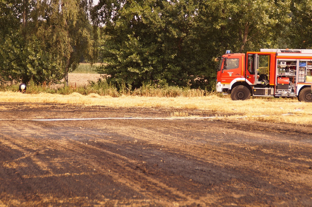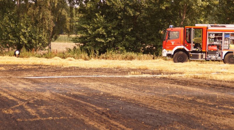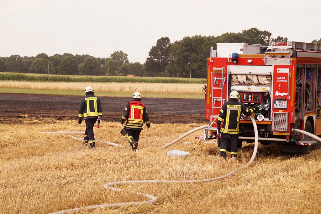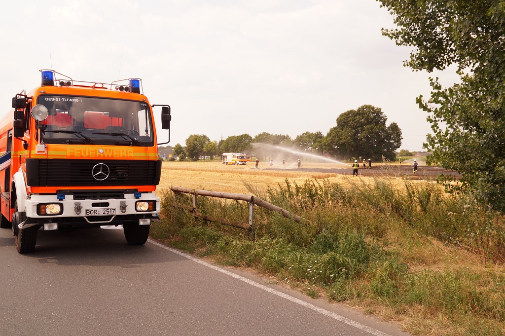 Gegen 13:19 Uhr wurde die Feuerwehr Gescher zu einem Flächenbrand eines Getreidefeldes am Mühlengrund gerufen. Dort hatte sich aufgrund eines technischen Defektes einer Mähdrescher das Stroh in der Maschine entzündet und das Feld in Brand gesetzt. Der Fahrer der Maschine konnte den Brand mit einem Feuerlöscher am Fahrzeug löschen und das Fahrzeug aus dem Gefahrenbereich fahren. Die hinzugerufene Feuerwehr begann sofort mit den Löscharbeiten auf dem Feld und verhinderte so eine Ausbreitung in die angrenzende Wallhecke. Dazu wurde die Wasserversorgung aus zwei Hydranten an der Straße entnommen und bis zur Einsatzstelle gefördert. Dort wurde mit 5 Strahlrohren das Feuer am Feuersaum gelöscht. Anschließend wurde das Feld an der Brandstelle durch den Landwirt untergegrubbert. Der DRK Ortsverein versorgte unterdessen die Einsatzkräfte mit Getränken.