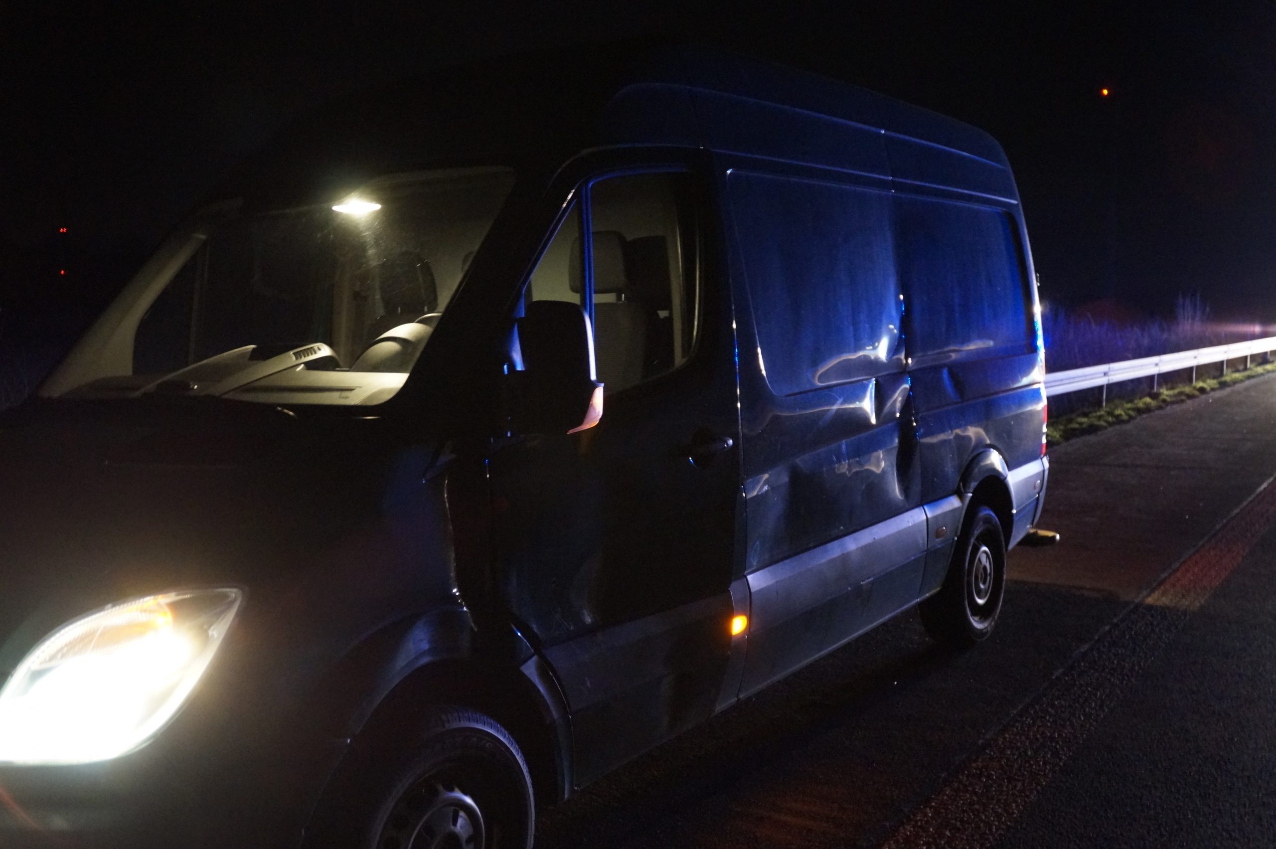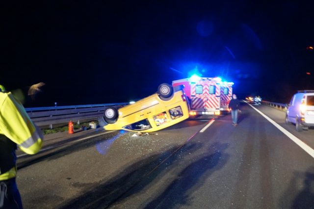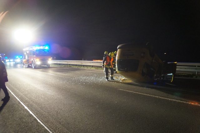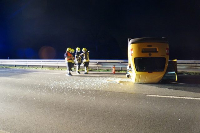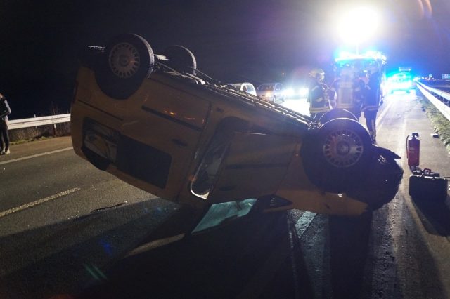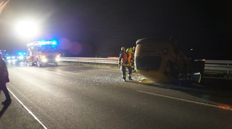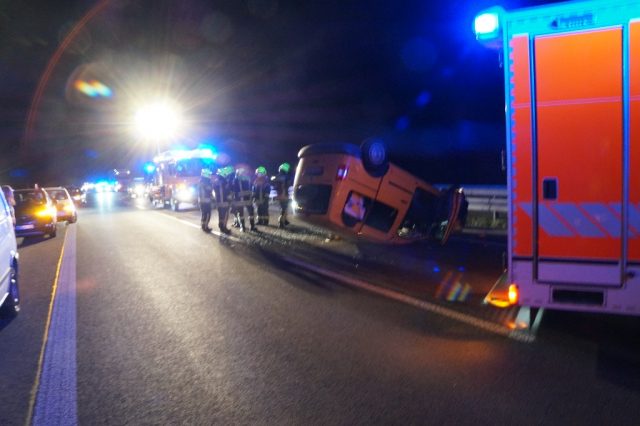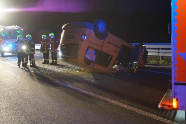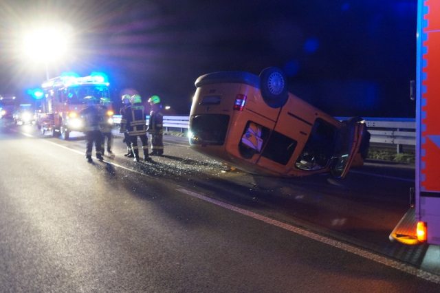 Gegen 19:00 Uhr wurde die Feuerwehr Gescher mit dem Stichwort „Verkehrsunfall Person eingeklemmt“ mit dem Zusatz mehrere beteiligte PKW alarmiert. Auf der A31 in Fahrtrichtung Oberhausen etwa 1,5 km hinter der Abfahrt Gescher geriet ein PKW auf der linken Fahrspur ins Schleudern. Dabei traf der PKW einen auf der rechten Fahrspur fahrenden Transporter seitlich. Zudem wurde die linke Mittelleitplanke getroffen. Schließlich blieb das Fahrzeug auf dem Dach auf der linken Fahrspur liegen. Bei Eintreffen der Feuerwehr hatte die Person bereits das Fahrzeug verlassen und wurde durch den zuvor eingetroffenen Rettugnswagen versorgt. Dabei leistete ein zufällig anwesender Notarzt sowie ein Feuerwehrmann bereits erste Hilfe. Der Fahrer wurde mit dem Rettungswagen zur weiteren Untersuchung ins Krankenhaus Borken gebracht. Der zweite Fahrer verletzte sich bei der Kollison nicht. Weitere auf der Anfahrt befindliche Rettungsmittel sowie ein Großteil der Feuerwehr Gescher konnten daher die Einsatzstelle direkt wieder verlassen. Es verblieb das HLF 20 und der Kdow an der Einsatzstelle. Sie leuchteten die Einsatzstelle aus und reinigte die Fahrbahn und unterstützte bei der Fahrzeugbergung durch ein Abschleppunternehmen. Das zweite beteiligte Fahrzeug war weiterhin fahrbereit. Die Autobahn musste bis zur Fahrzeugbergung gesperrt bleiben. Einem im Stau befindlichen PKW-Fahrer half die Feuerwehr ebenfalls, da dieser aufgrund einer leeren Batterie nicht wieder ansprang.