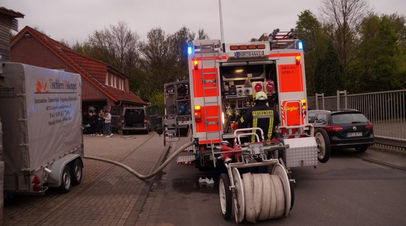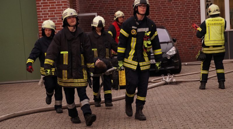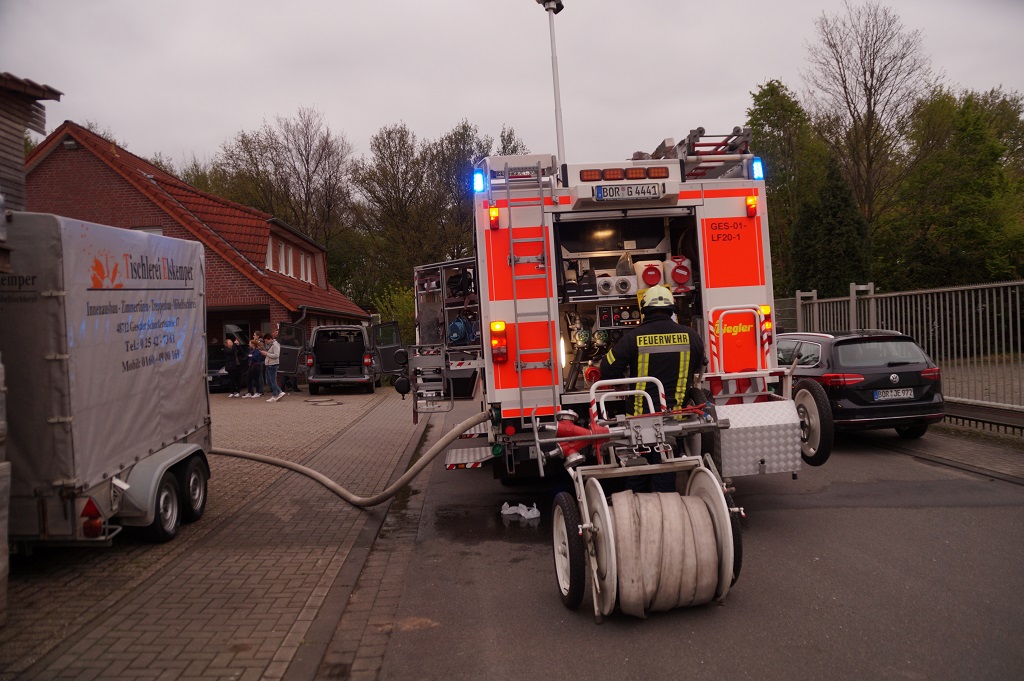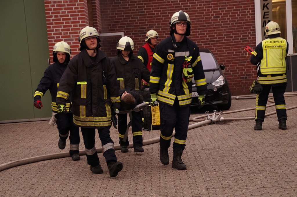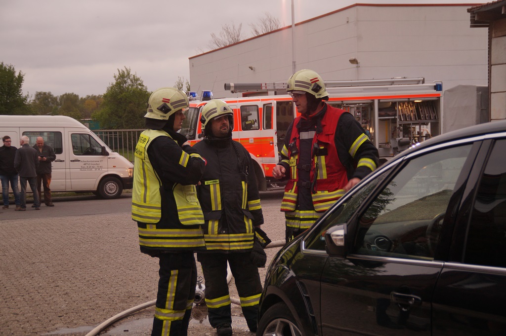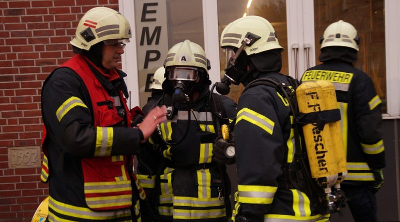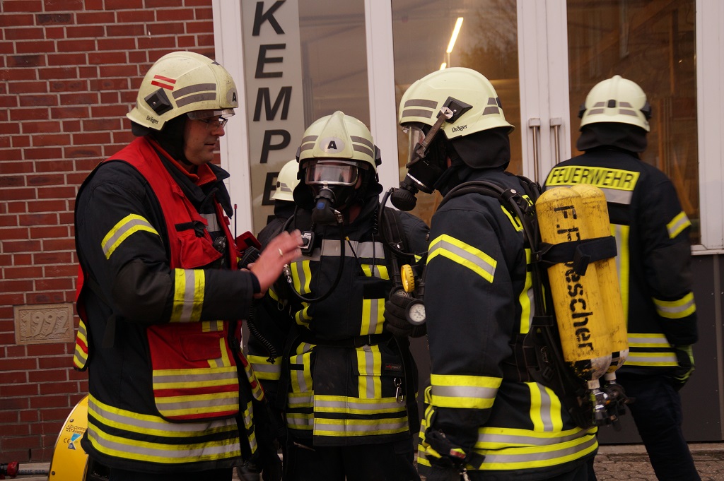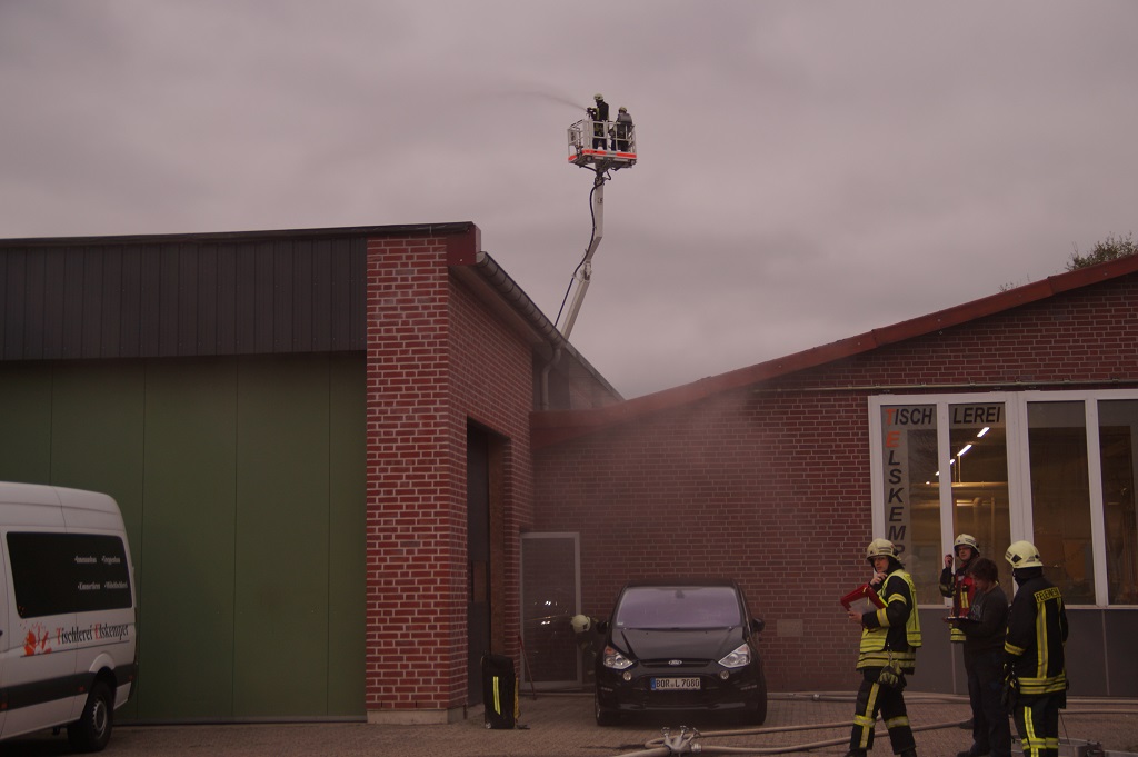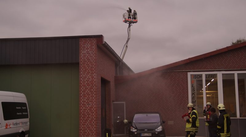 So führte der Brandeinsatz zur Schreinerei Elskemper. Dort sollte es in der Produktionshalle brennen und zeitgleich wurden zwei Arbeiter vermisst. Die Halle wurde im Vorfeld vernebelt. Die ersten Kräfte wurden sofort zur Menschenrettung eingeteilt. Zeitgleich wurde ein Löschangriff aufgebaut. Nach der Rettung der Personen wurden auch noch in der Werkstatt befindliche Gasflaschen in Sicherheit gebracht.