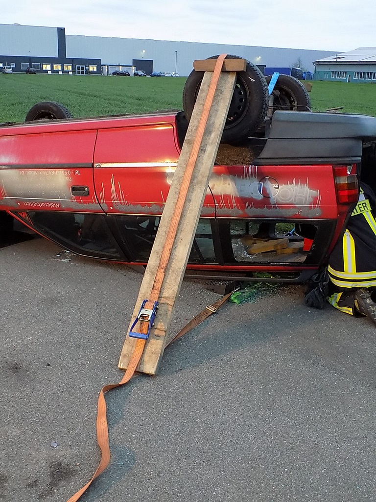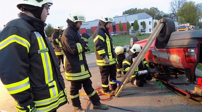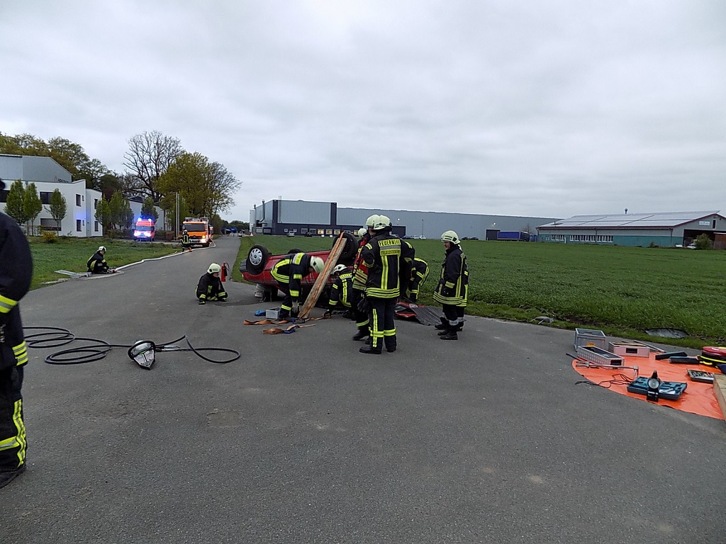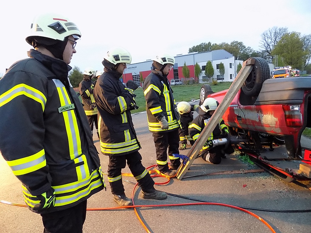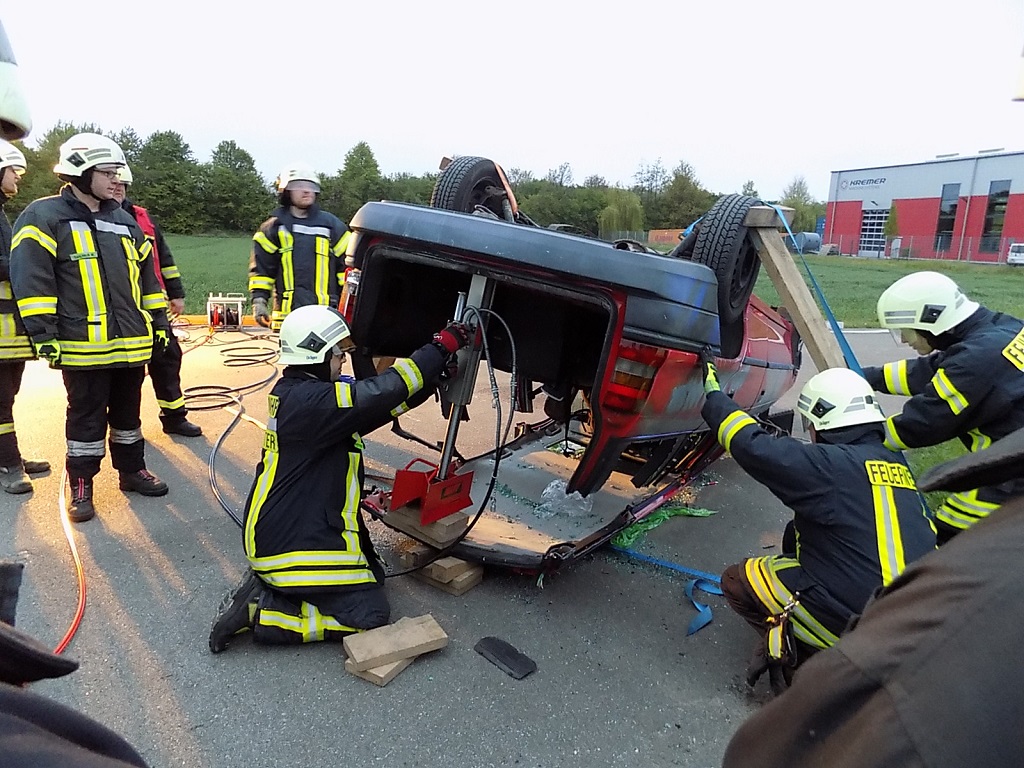 Bei der technischen Hilfeleistung galt es mit begrenztem Material zeitgleich die Rettung an zwei PKWs durchzuführen. Ein PKW lag auf der Seite und ein PKW auf dem Dach. So konnten neben dem üblichen Ablauf bei einem PKW Unfall auch die Rettung aus den nicht ganz üblichen Lagen geübt werden und verschiedene Vorgehensweisen ausprobiert und beübt werden.