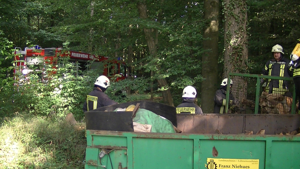 Zu einem Einsatz „verdächtiger Rauch“ an der A31 wurde die Feuerwehr Gescher gerufen. Da die genaue Einsatzstelle nicht bekannt war wurde zeitgleich die Feuerwehr Legden gerufen. Dank Luftunterstützung durch den zufällig vorbeifliegenden Rettungshubschrauber Christoph Euro 2 konnte die Einsatzstelle dann genauer lokalisiert werden. Diese befand sich in Beikelort in Legden. Dort brannte ein Anhänger der mit Brennholz beladen war mitten im Wald. Gemeinsam wurde das Feuer dann gelöscht.
