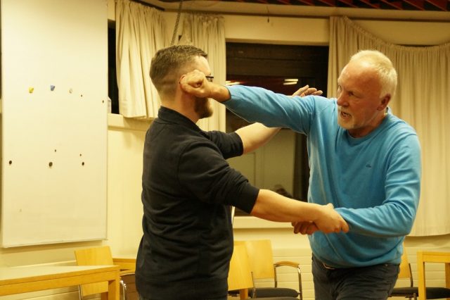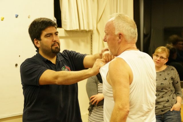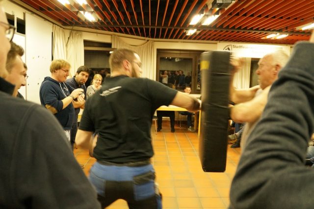 Martin Stricker zeigte den Kameraden der Feuerwehr dabei effektive und einfache Methoden um sich gegen Gewalt behaupten zu können. Das Erlernte konnten die Kameraden anschließend in Übungen praktisch erproben.