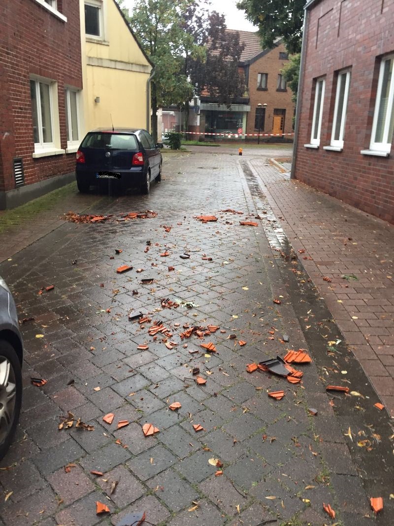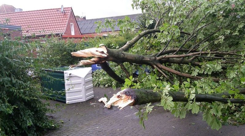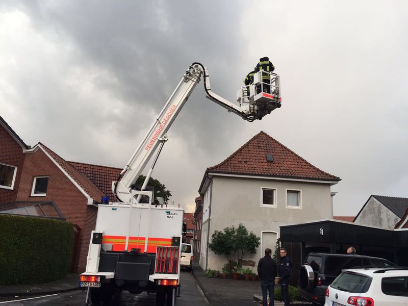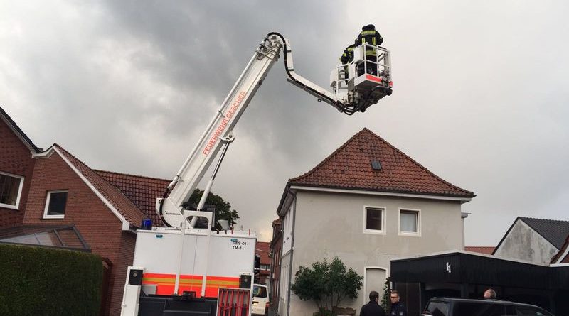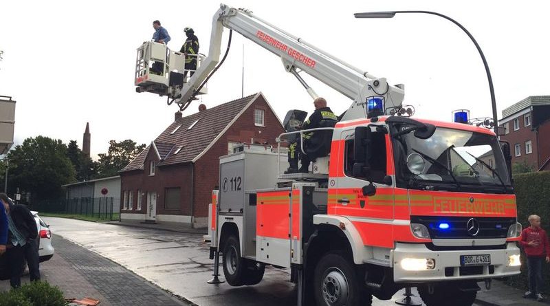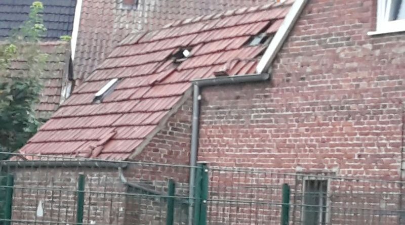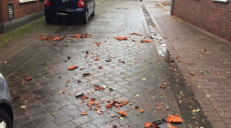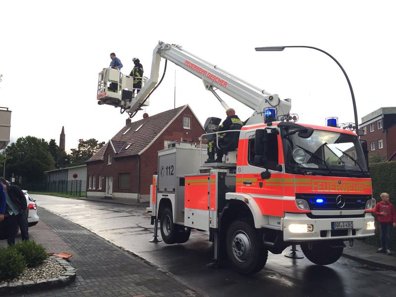 Eine Windhose ist Sonntagabend durch einige Straßenzüge von Gescher gezogen und hat erheblichen Sachschaden angerichtet. Gegen 19.40 Uhr, als es andernorts nur stark regnete, wurden die Anwohner im Bereich Königstraße und Zur Hambrücke auf das Wetterphänomen aufmerksam. „Das hat nur wenige Sekunden gedauert, dann war es vorbei“, berichtete Matthias Efsing. An mindestens zehn Häusern, so Einsatzleiter Marko Bricke von der Feuerwehr Gescher, wurden die Dächer beschädigt. Auf dem Parkplatz vor dem früheren Jugendzentrum Hotspot stürzte ein Baum auf drei Pkw. Einen weiteren Baum musste die Wehr sicherheitshalber fällen. Kaputte Dachziegel und Astwerk verschmutzten die Straßen. Verletzt wurde glücklicherweise niemand. Die Feuerwehr war gut drei Stunden im Einsatz.
