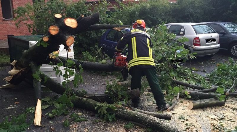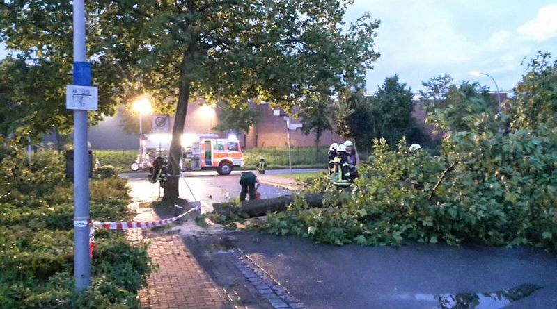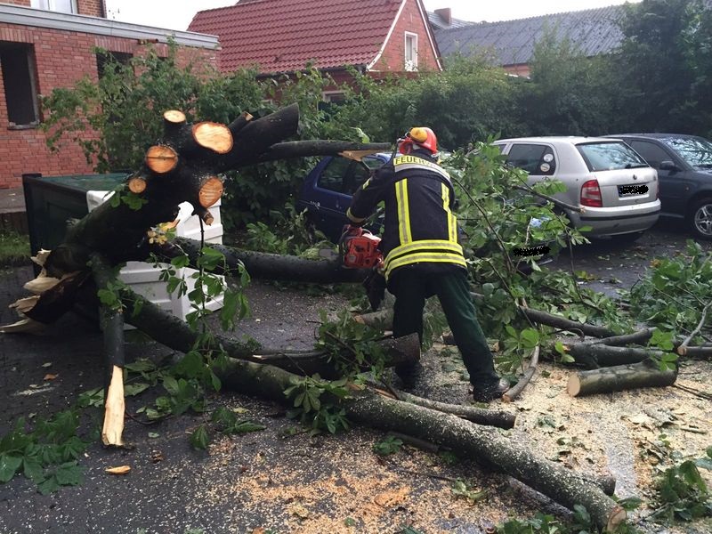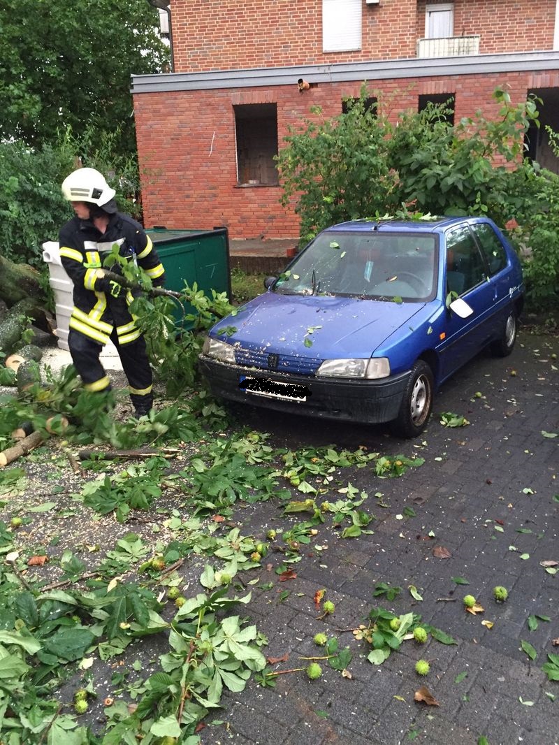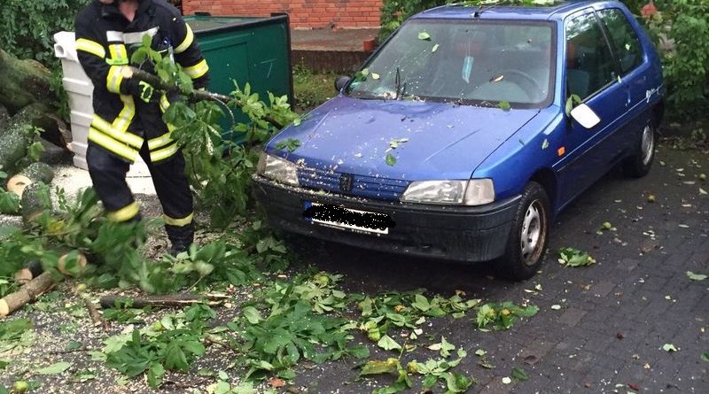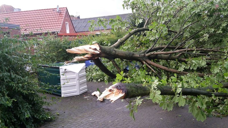 Eine Windhose ist Sonntagabend durch einige Straßenzüge von Gescher gezogen und hat erheblichen Sachschaden angerichtet. Gegen 19.40 Uhr, als es andernorts nur stark regnete, wurden die Anwohner im Bereich Königstraße und Zur Hambrücke auf das Wetterphänomen aufmerksam. „Das hat nur wenige Sekunden gedauert, dann war es vorbei“, berichtete Matthias Efsing. An mindestens zehn Häusern, so Einsatzleiter Marko Bricke von der Feuerwehr Gescher, wurden die Dächer beschädigt. Auf dem Parkplatz vor dem früheren Jugendzentrum Hotspot stürzte ein Baum auf drei Pkw. Einen weiteren Baum musste die Wehr sicherheitshalber fällen. Kaputte Dachziegel und Astwerk verschmutzten die Straßen. Verletzt wurde glücklicherweise niemand. Die Feuerwehr war gut drei Stunden im Einsatz.