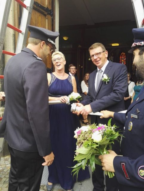 Das Ehrenspalier für das Silberpaar Andrea und Uwe Meyer bildeten die Mitglieder der Freiwilligen Feuerwehr Gescher am vergeangenen Freitag. Erst nachdem das Silberpaar Teamgeist bewiesen hatte indem sie gemeinsam eine Schlauchkupplung lösten, konnten sie das Spalier durchschreiten. Laut schallte der Feuerwehrmannsgruß durch die Innenstadt. Zu den ersten Gratulanten zählte Löschzugführer Stefan Theßeling.