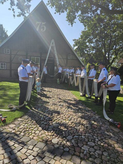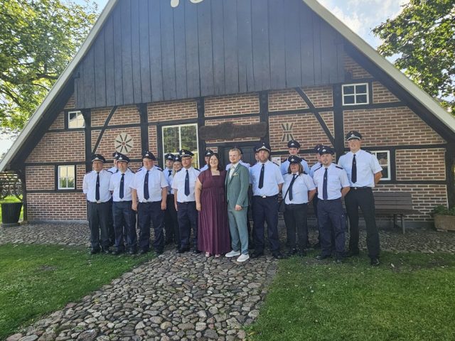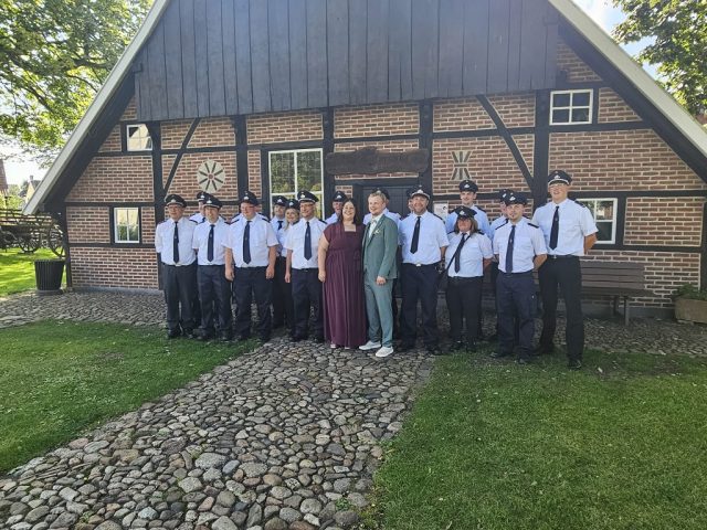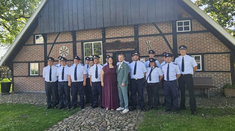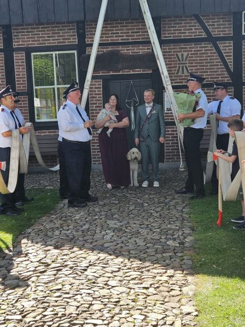 Aus einem freudigen Anlass trafen sich jetzt die Kameraden des Löschzuges Hochmoor am 24.08. am Heimathaus in Gescher. Zur Hochzeit von Wiebke und Marcel (Kerkfeld) Rohling wurde dort das Ehrenspalier gebildet. Erst nachdem das Paar Teamgeist bewiesen hatten und sie gemeinsam eine Schlauchkupplung lösten, konnten sie das Spalier durchschreiten. Zu den ersten Gratulanten zählten der Stadtbrandinspektor Dirk Lütkenhaus sowie der Löschzugführer Mike Schulz.