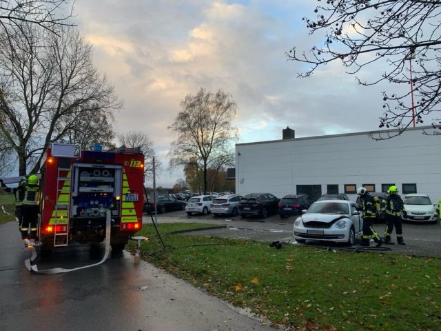 Gegen 8:20 Uhr wurde die Feuerwehr Gescher zu einem PKW Brand ins Industriegebiet Hochmoor gerufen. Es wurde ein Fahrzeugbrand gemeldet. Vor Ort wurde dann auf dem Firmenparkplatz ein Feuer im Motorraum eines PKWs festgestellt, so dass die Einsatzfahrzeuge aus Gescher die Einsatzfahrt abbrechen konnten. Der PKW wurde unter Atemschutz zunächst mit Wasser und dann mit Schaum gelöscht.