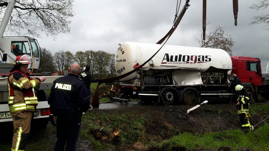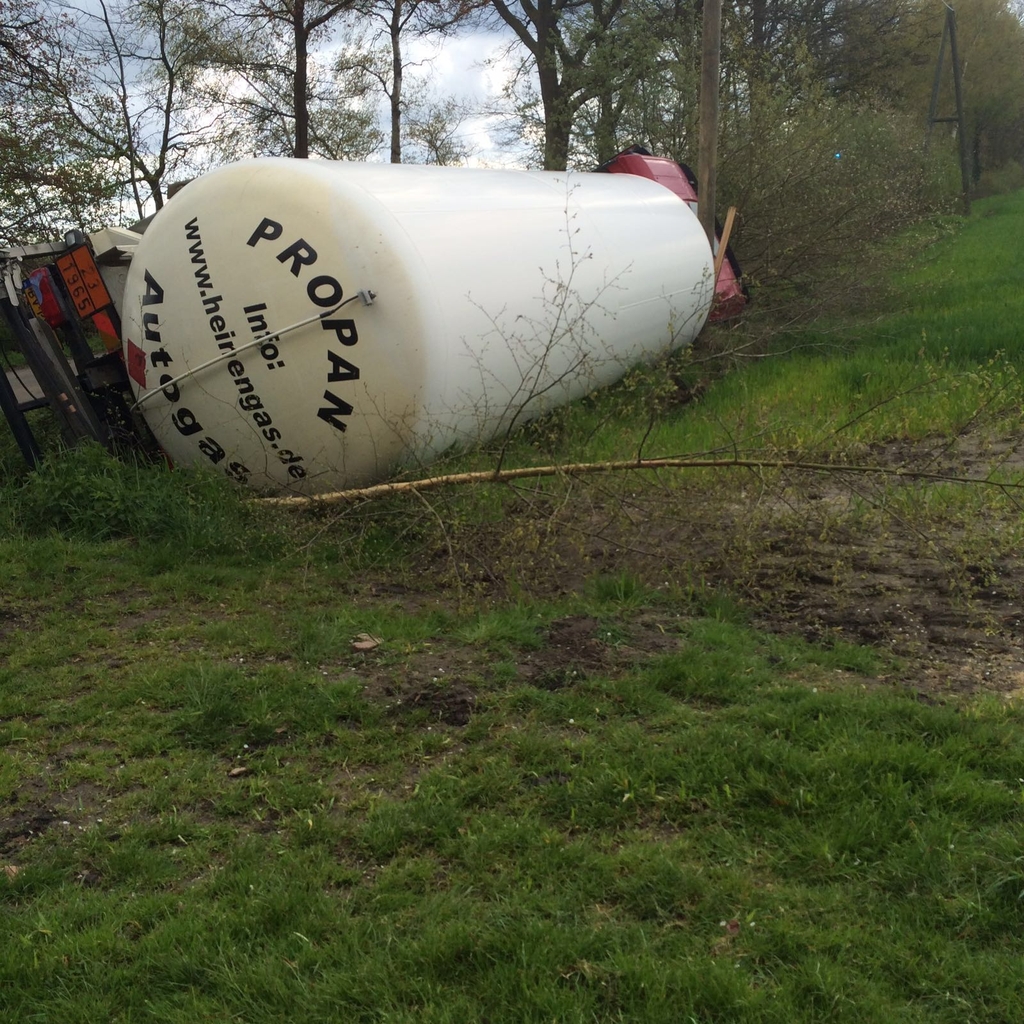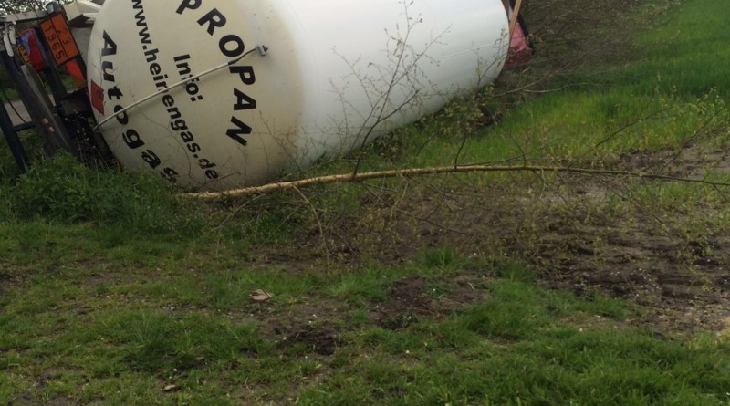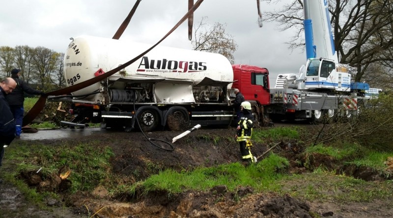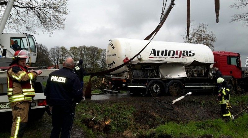In der Bauernschaft Stevede ist am Montagmorgen ein Tanklastzug der mit Gas beladen war auf dem Weg zu einer Belieferung auf einem Feldweg von der Straße abgekommen und seitlich in einen Straßengraben zum Liegen gekommen. Da erste Messungen einen Gasaustritt bestätigten, forderte die  Feuerwehr Coesfeld die Tanklöschfahrzeuge aus Gescher und Reken zur Absicherung nach. Umfangreiche Vorbereitungsmassnahmen (es mussten Bäume gefällt werden und eine provisorische Kranaufstandsfläche geschaffen werden) sorgten für einen langwierigen Einsatz, da die eigentliche Bergung erst am Abend erfolgen konnte. Daher wurde die Besatzung des Tanklöschfahrzeuges einmal ausgetauscht. Während der Bergung wurde dann Wasser abgegeben, um austretendes Gas nieder zu schlagen und eventuelle Funkenbildung zu minimieren. Unser TLF war bis zum Abschluss der Bergung gegen 19:15 Uhr vor Ort.
