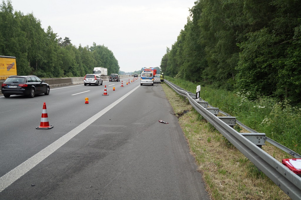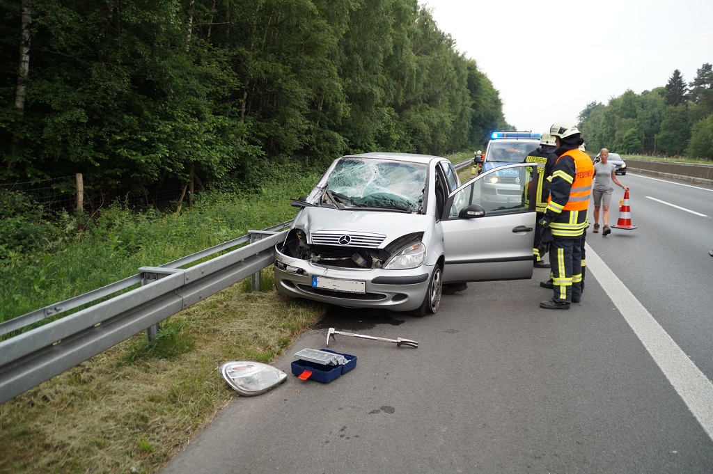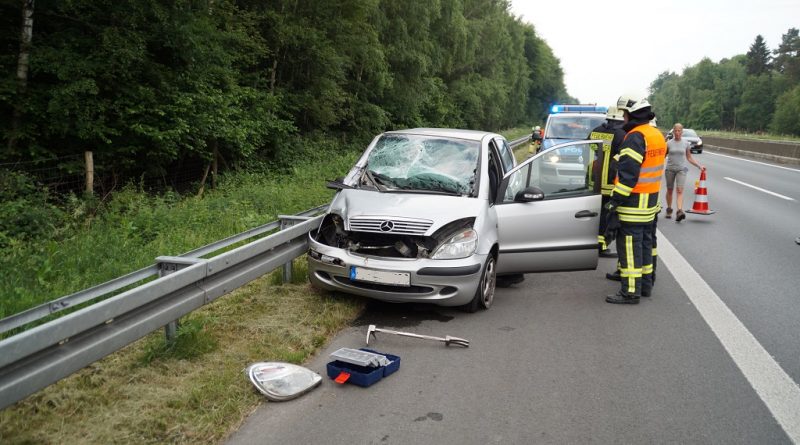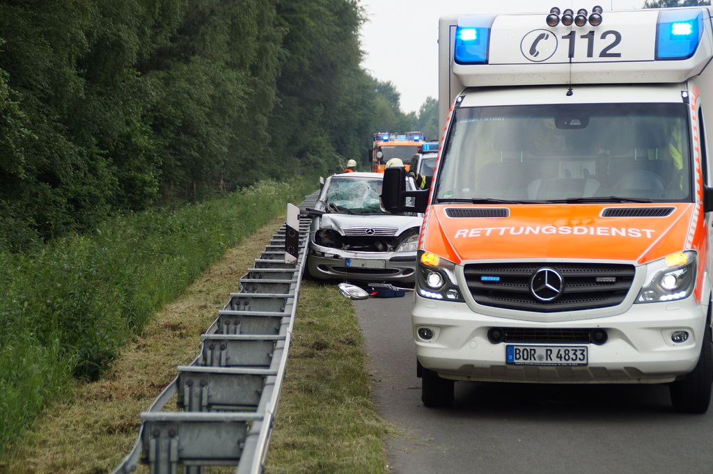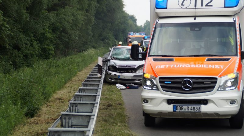 Auf der A 31 ist es in Fahrtrichtugn Emden zu einem Unfall zwischen einem PKW und einem LKW gekommen. Wahrscheinlich aufgrund eines gesundheitlichen Problemes eines PKW-Fahrers aus Moers ist ein PKW zunächst seitlich in das Heck eines LKWs gefahren. Anschließend krache der PKW gegen die Leitplanke und blieb in der Leitplanke liegen. Eine zufällig vorbeifahrende Mitarbeiterin eines Schwerlastsicherungsfahrzeuges sicherte zunächst die Einsatzstelle ab. Der PKW-Fahrer erlitt augenscheinlich keine Verletzung, wurde aber aufgrund des wahrscheinlichen gesundheitlichen Problems mit dem Rettungswagen ins Krankenhaus Ahaus gebracht. Die Feuerwehr sicherte die Einsatzstelle weiter ab. Sie trennten die Fahrzeugbatterie ab und streuten das ausgetretene Betriebsmittel ab. Anschließend übergaben sie die Einsatzstelle an die Polizei und rückten wieder ein.