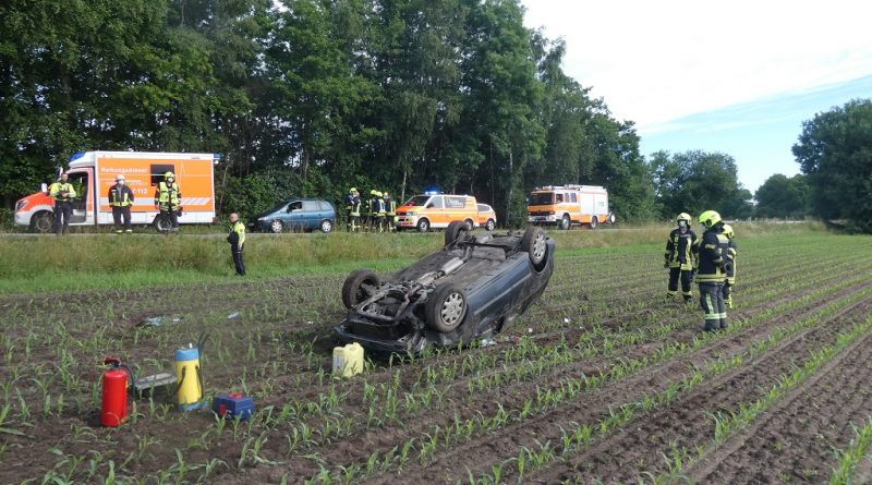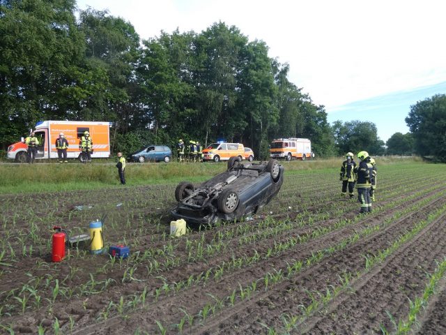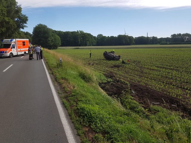 Gegen 8:44 Uhr wurde die Feuerwehr Gescher erneut zu einem Verkehrsunfall alarmiert, diesmal auf der L829 kurz vor Velener Gemeindegebiet. Dort ist ein Fahrer nach eigenen Angaben einer Gruppe Rehe ausgewichen und dabei von der Straße abgekommen und hat sich mehrfach überschlagen. Das Fahrzeug blieb auf dem Dach im angrenzenden Feld liegen. Der Fahrer konnte sich selbstständig aus dem Fahrzeug befreien. Bis zum Eintreffen des Rettungsdienstes versorgte die Feuerwehr den Patienten. Dieser wurde dann vom Rettungwagen Südlohn ins Krankenhaus Borken transportiert. Ein hinzugerufener Rettungshubschrauber kam nicht mehr zum Einsatz. Anschließend unterstützte die Feuerwehr Gescher bei der Bergung des Fahrzeuges.