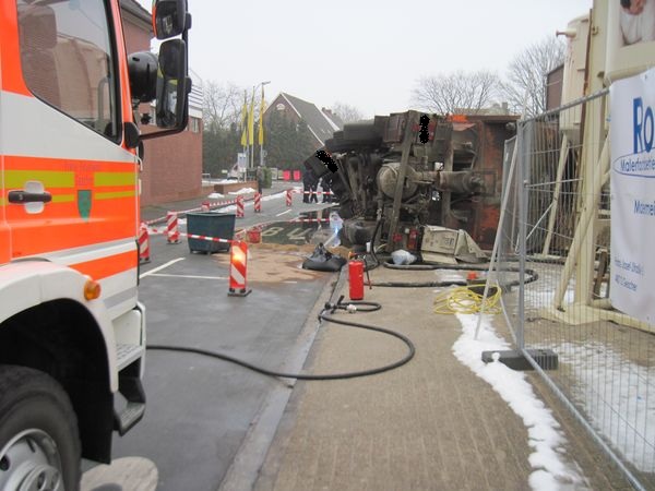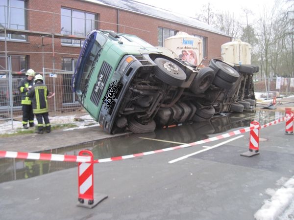 Ein mit Sand beladener LKW ist am frühen Dienstagmorgen beim Entladen umgekippt. Ein Bauarbeiter konnte sich durch einen Hechtsprung vor dem umstürzenden LKW in Sicherheit bringen und blieb unverletzt. Der LKW beschädigte beim Umkippen einen Hydranten, sodass große Mengen Wasser ausgetreten waren und sich mit auslaufendem Diesel und Hydrauliköl gemischt hatten. Die Feuerwehr dichtete Gullideckel ab und streute das Öl-/Dieselgemisch mit entsprechendem Bindemittel ab.