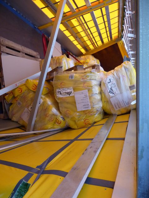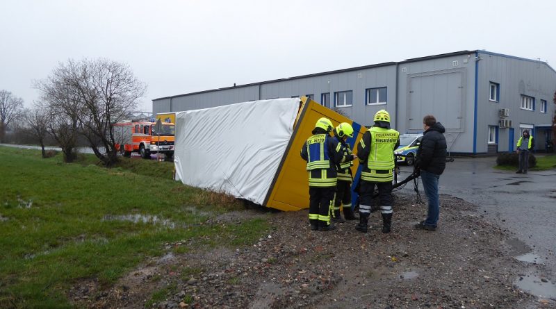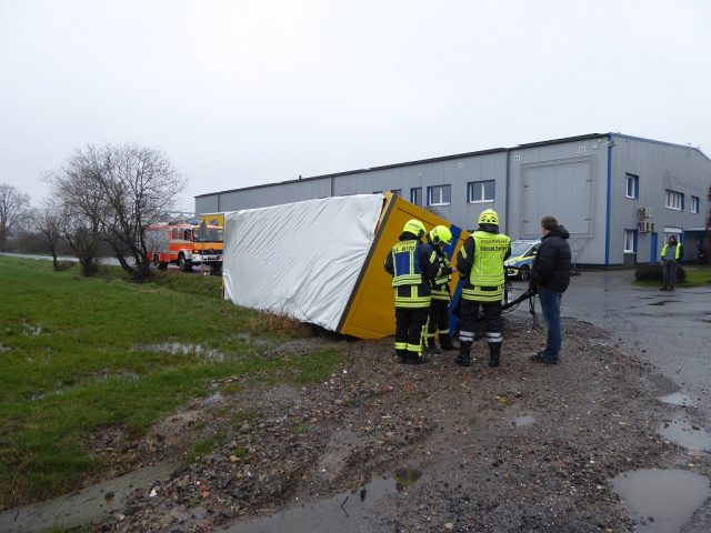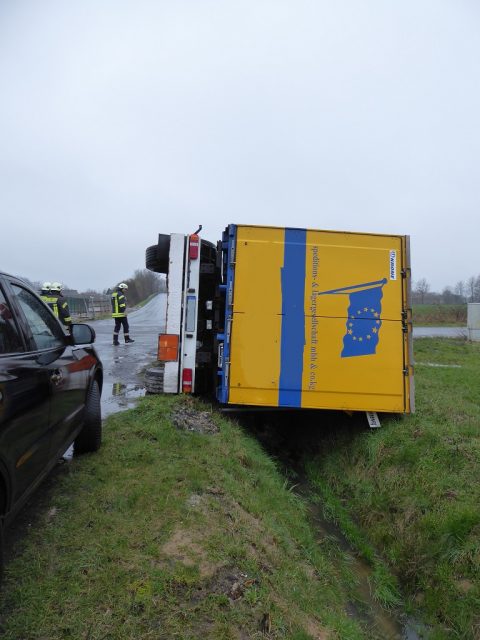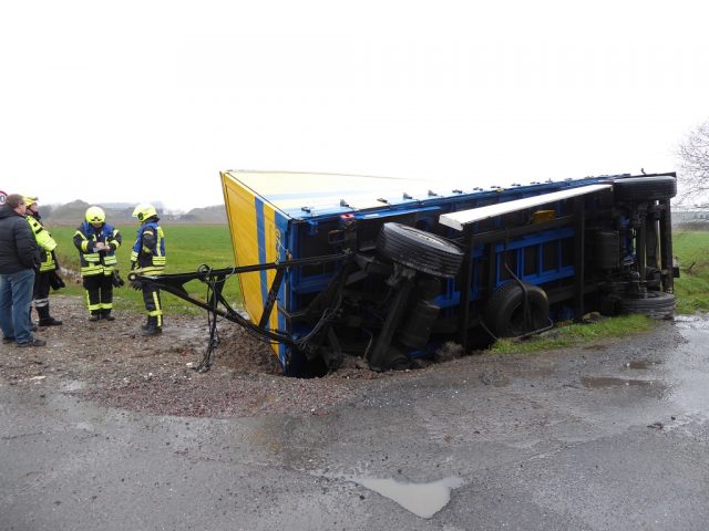 Dabei hatte sich die Ladung teilweise gelöst und ist auf die Seitenwand und dem Dach gekippt. Bei der Ladung, Futterzusätze in Säcken, handelt es sich aufgrudn der Menge und Konzentration nach ADR um kennzeichnungspflichtiges Gefahrgut. Da die Säcke nicht beschädigt wurden, wurde in Absprache zwischen Feuerwehr, Ordnungsamt und dem Bergungsunternehmen, das Bergungsunternehmen mit dem Abladen und Aufrichten beauftragt. Die Feuerwehr verblieb an der Einsatzstelle bis zum Eintreffen des Bauhofes, die die Straße absperrte. Die Straße bleibt bis zur Bergung des LKW-Anhängers weiter gesperrt.