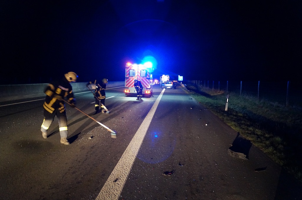 Die Feuerwehr Gescher wurde am späten Abend zu einem Verkehrsunfall auf die A31 unweit des Parkplatzes Holtwicker Mark gerufen, um die Einsatzstelle und den dort eingesetzten Rettungswagen abzusichern. Bei dem Unfall waren zwei PKWs beteiligt. Während ein PKW auf der rechten Spur lag, blieb der andere PKW auf der linken Spur quer stehen. Der Verkehr lief bei Eintreffen der Feuerwehr zwischen diesen beiden PKWs weiter. Daher sicherte die Feuerwehr zunächst beide Fahrzeuge ab. Nach Eintreffen der Polizei wurde das Fahrzeug auf der linken Spur auf den Seitenstreifen geschoben, so dass der Verkehr in der Folge ohne Spurwechsel die Einsatzstelle passieren konnte. Die Feuerwehr streute ausgelaufene Betriebsstoffe ab und reinigte die Fahrbahn von den Unfallspuren wie Glassplitter und Fahrzeugteilen. Der Rettungswagen transportierte eine Person ins Krankenhaus nach Ahaus.