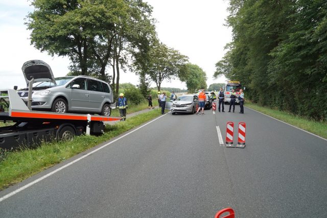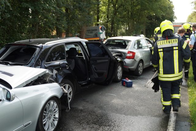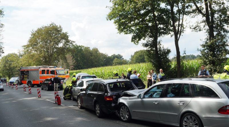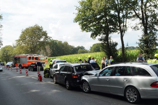 Zu einem Verkehrsunfall auf der B525 ist die Feuerwehr Gescher am Sonntag gegen 15:35 Uhr gerufen worden. Dort war es zu einem Unfall mit fünf beteiligten Fahrzeugen gekommen. Dabei verletzen sich zwei der Insassen leicht. Vier der Fahrzeuge erlitten einen Totalschaden.