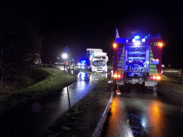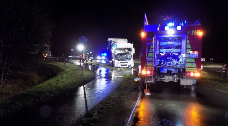 Gegen 6:30 Uhr wurde der Löschzug Hochmoor zu einem LKW Unfall am Kreisverkehr L608 / Velener Straße gerufen. Dort hatte ein LKW-Fahrer den Kreisverkehr übersehen.