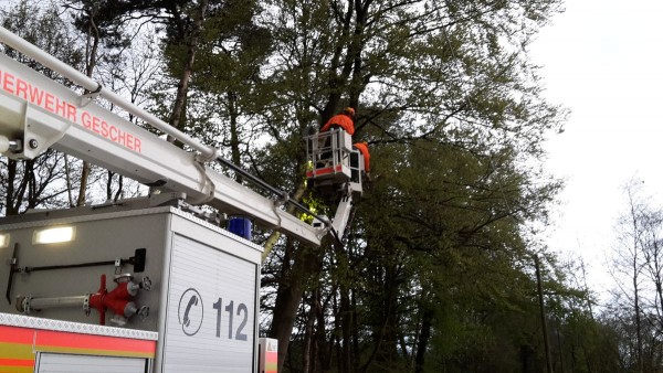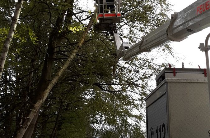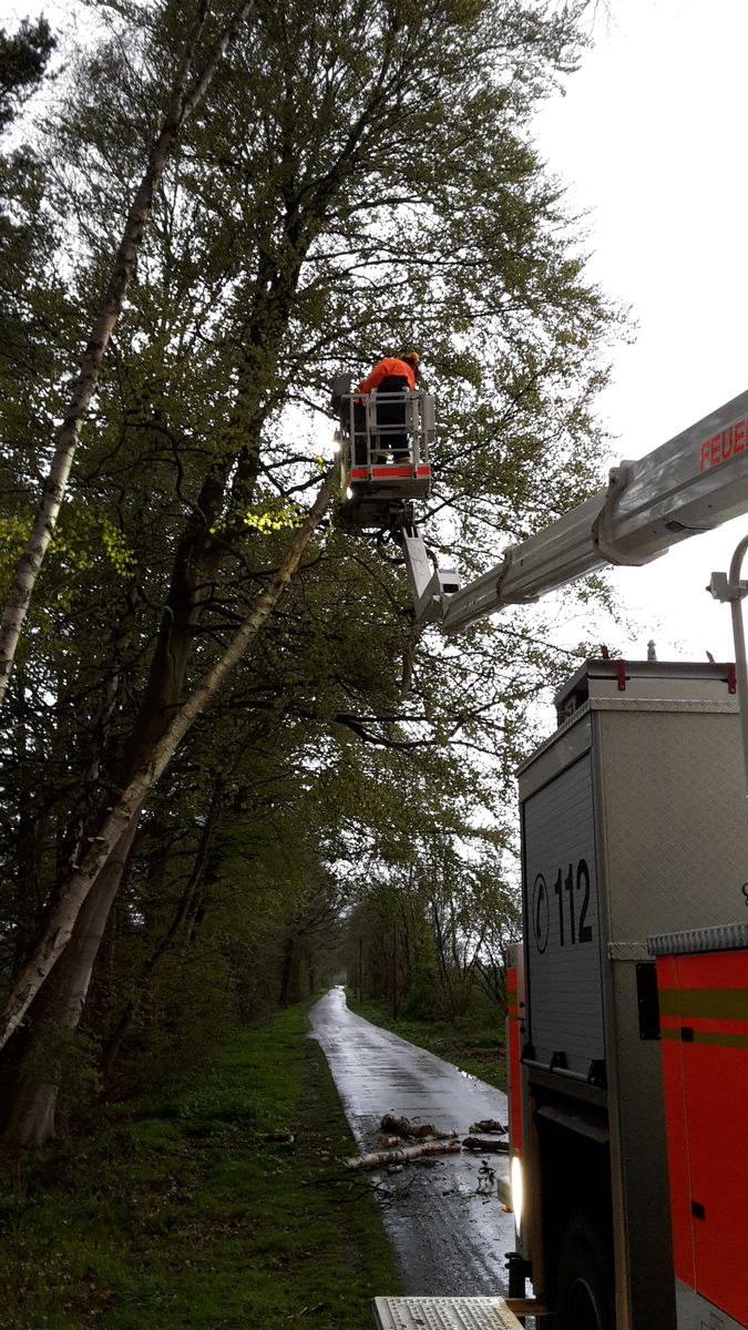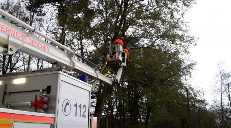 Ein aufmerksamer Anwohner bemerkte in der nähe des ehemaligen Fünf Finger Weg einen Baum der auf die Fahrbahn zu stürzen drohte und informierte die Feuerwehr. Mit Hilfe des Teleskopmast konnten die alarmierten Kameraden den Baum beseitigen und die Fahrbahn reinigen.