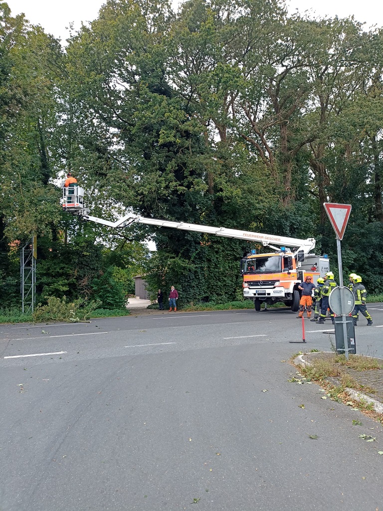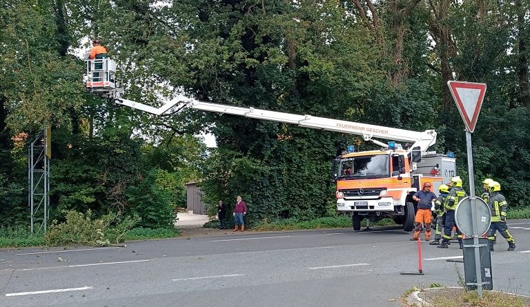 Gleich zweimal musste die Feuerwehr Gescher am Freitag zu dem Stichwort „Baum auf Fahrbahn“ ausrücken. So wurde sie zunächst gegen 13:25 Uhr auf den Brink gerufen. Da diese Einsatzstelle im Stadpark lag, wurde der Bauhof hinzualarmeirt, um die Einsatzstelle zu sichern und zu beseitigen. Gegen 14:30 Uhr wurde sie dann zur Bahnhofstraße gerufen. In diesem Fall beseitigte die Feuerwehr die Gefahrenstelle mit der Kettensäge aus dem Teleskopmast heraus. Während der Beseitigung auf der Bahnhofstraße musste die Straße gesperrt werden. Dieses führte zu großen Verkehrsstörungen.