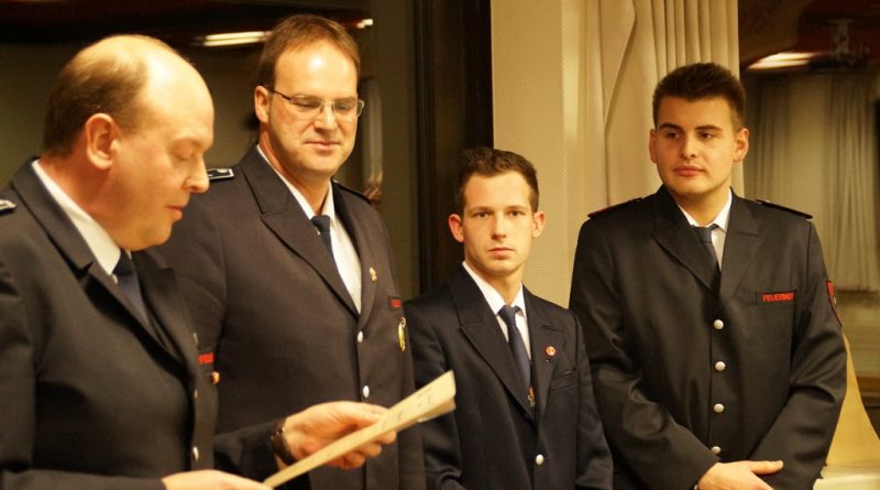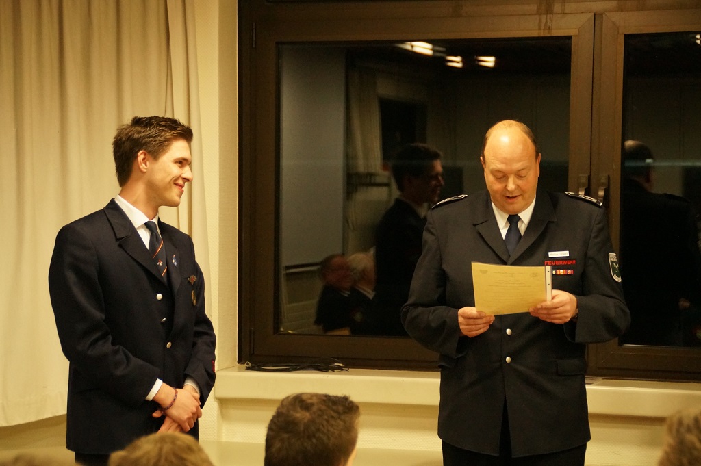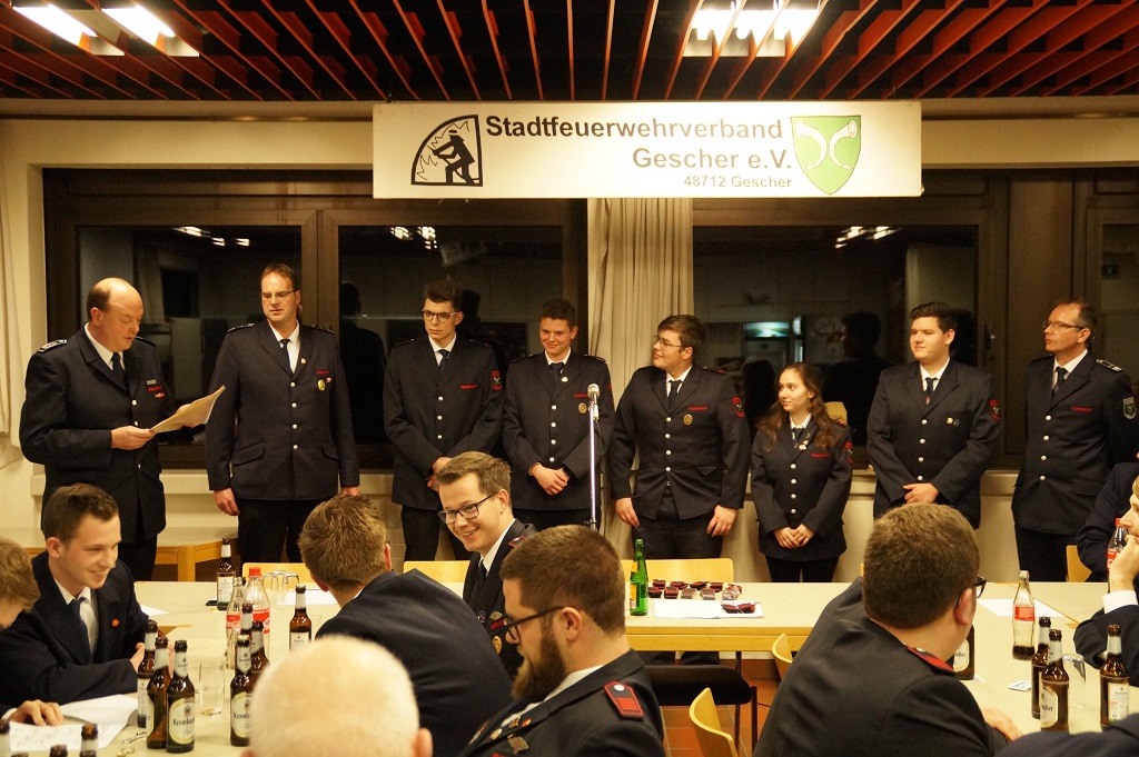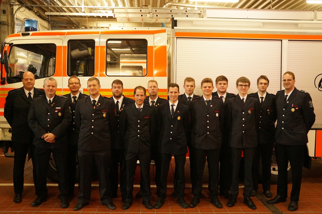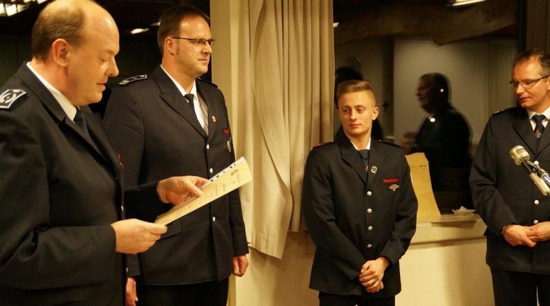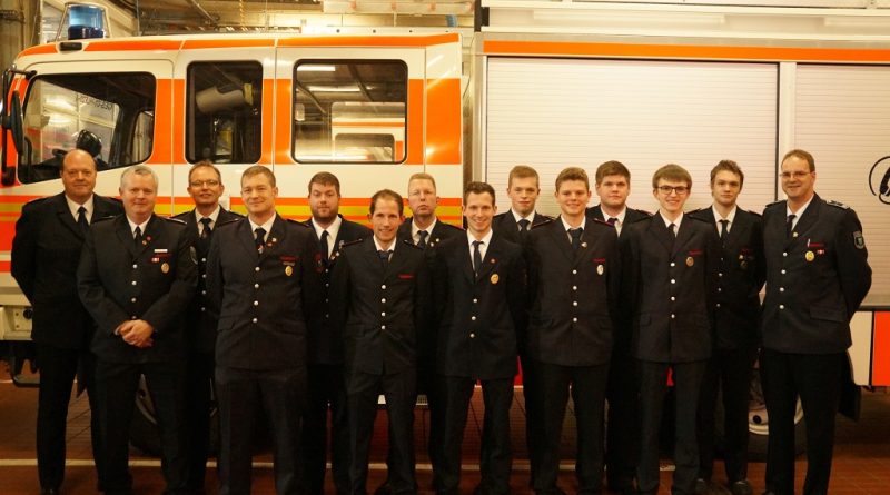 Der nächste Punkt der Tagesordnung, Ehrungen, Ernennungen und Beförderungen, nahm dann einen großen Teil der Versammlung ein. Die Beförderungen nahm der stellvertretende Leiter der Feuerwehr Markus Terwey vor. So wurden zunächst Lukas Büter, Matthias Ernst und Luca Mance zu Unterbrandmeistern befördert. Anschließend wurden dann die Beförderungen von Paul Scharfenberg, Hendrik Brocks, Justus Köjer, Jacqueline Kramme und Chris Barton zu Oberfeuerwehrmänner bzw. Oberfeuerwehrfrau ausgesprochen. Nach der Grundausbildung sind Florian Pollmann, Daniel Oberwies, Noah Roling, Felix Osterkamp und Erik Stomp zu Feuerwehrmännern ernannt worden. Niklas-Levent Bökenkamp und Daniel Osterkamp wurden aus der Jugendfeuerwehr zu Feuerwehrmannanwärter in die Einsatzabteilung übernommen. Zusätzlich wurden Noel Schwerma und Lucas Stahn als Quereinsteiger in die Feuerwehr aufnehmen.