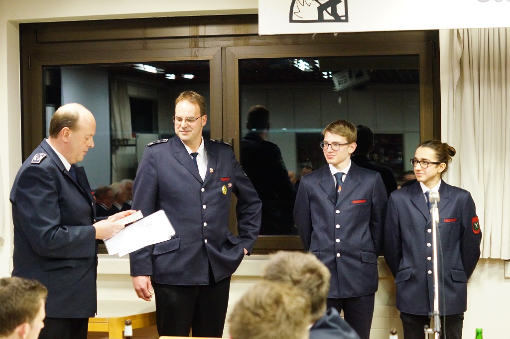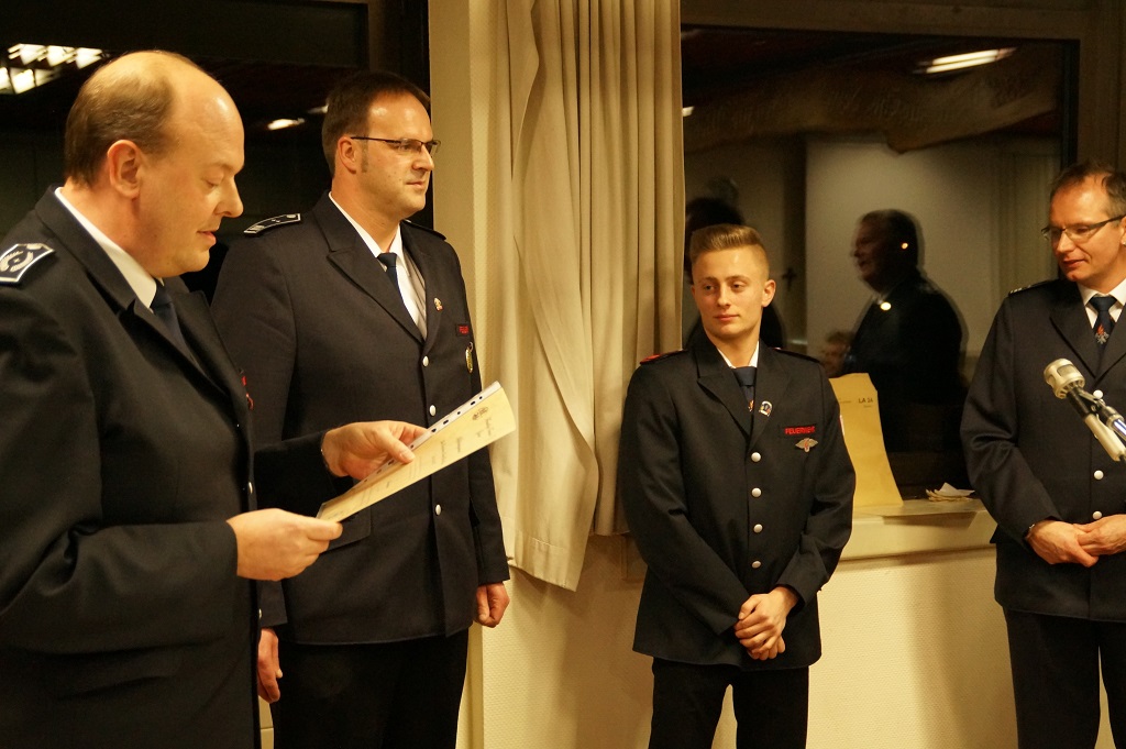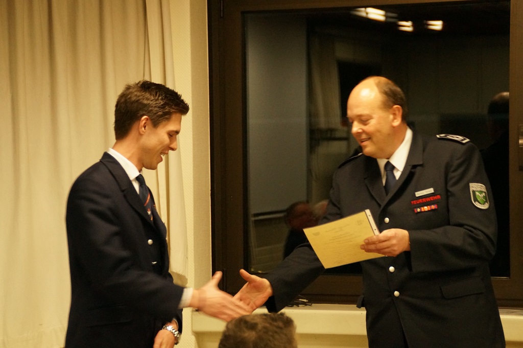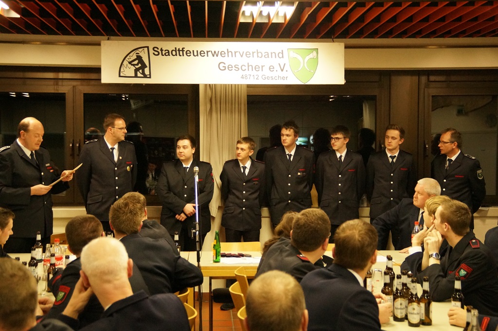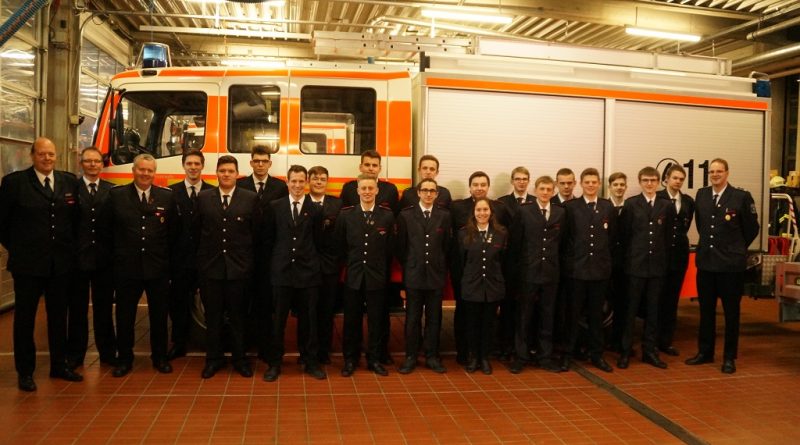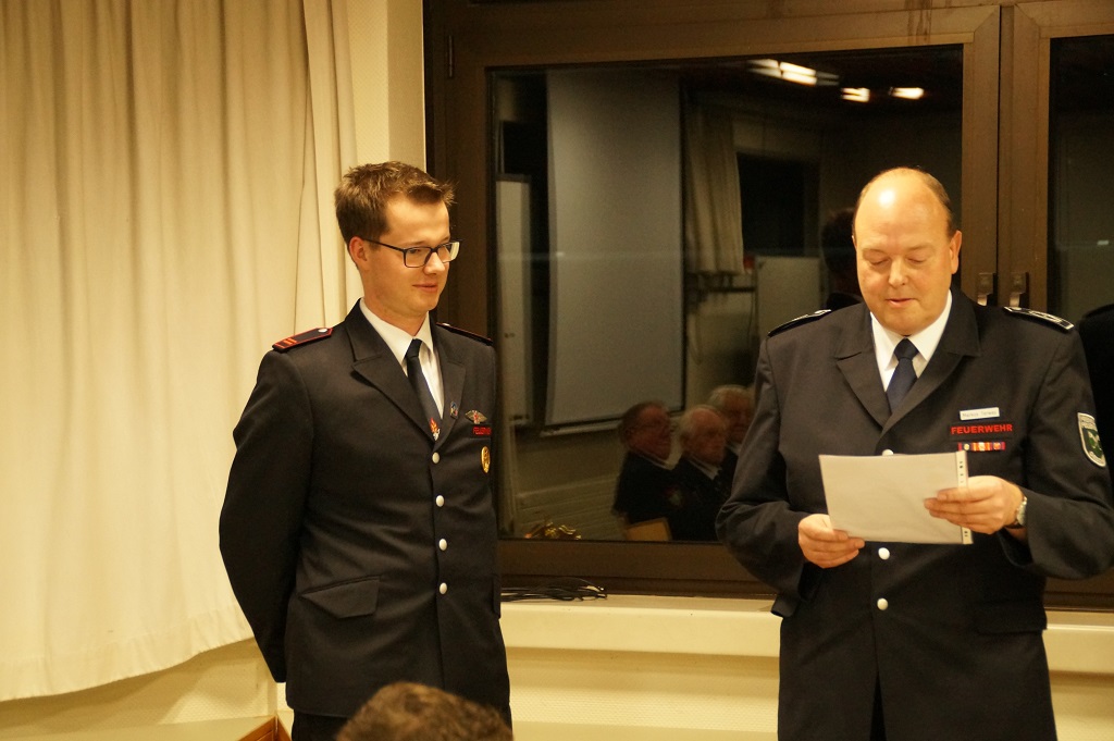Der nächste Punkt der Tagesordnung, Ehrungen, Ernennungen und Beförderungen, nahm dann einen großen Teil der Versammlung ein. Die Beförderungen nahm der stellvertretende Leiter der Feuerwehr Markus Terwey vor. So wurden zunächst Lukas Büter, Matthias Ernst und Luca Mance zu Unterbrandmeistern befördert. Anschließend wurden dann die Beförderungen von Paul Scharfenberg, Hendrik Brocks, Justus Köjer, Jacqueline Kramme und Chris Barton zu Oberfeuerwehrmänner bzw. Oberfeuerwehrfrau ausgesprochen. Nach der Grundausbildung sind Florian Pollmann, Daniel Oberwies, Noah Roling, Felix Osterkamp und Erik Stomp zu Feuerwehrmännern ernannt worden. Niklas-Levent Bökenkamp und Daniel Osterkamp wurden aus der Jugendfeuerwehr zu Feuerwehrmannanwärter in die Einsatzabteilung übernommen. Zusätzlich wurden Noel Schwerma und Lucas Stahn als Quereinsteiger in die Feuerwehr aufnehmen.
